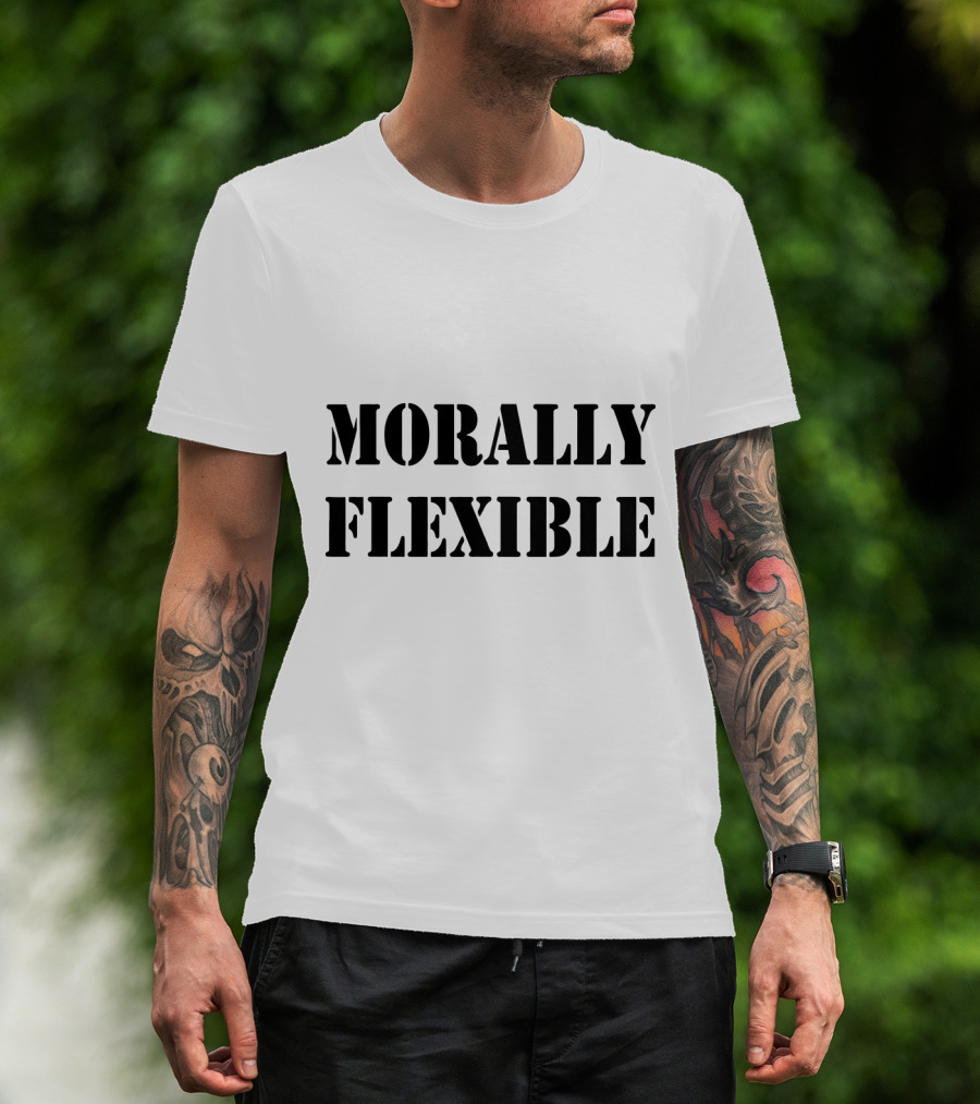 The Morally Flexible Stencil T-shirt is designed for everyday wear and a consistent fit. Fabric is pre-shrunk ring-spun cotton with durable stitching. See the size chart below for exact measurements.