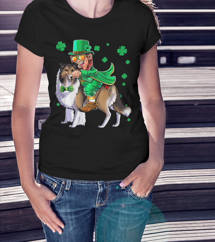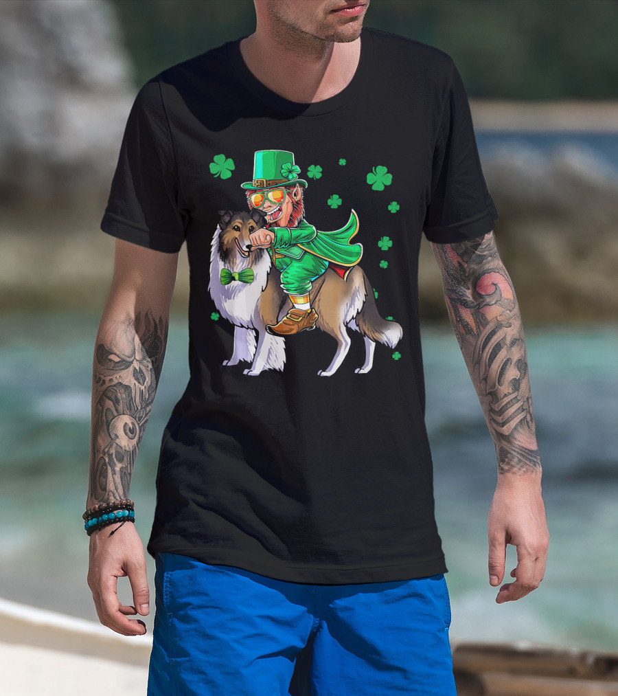 Leprechaun Riding Collie With Shamrocks For St. Patrick's Day T-Shirt