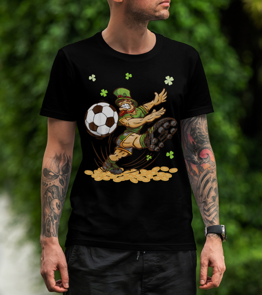 Leprechaun Playing Soccer Surrounded By Shamrocks And Gold Coins T-Shirt