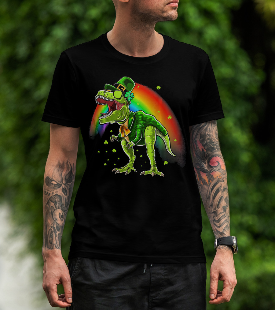 St. Patricks Day T-Rex Dinosaur Leprechaun With Rainbow And Shamrocks T-Shirt