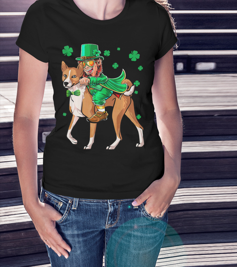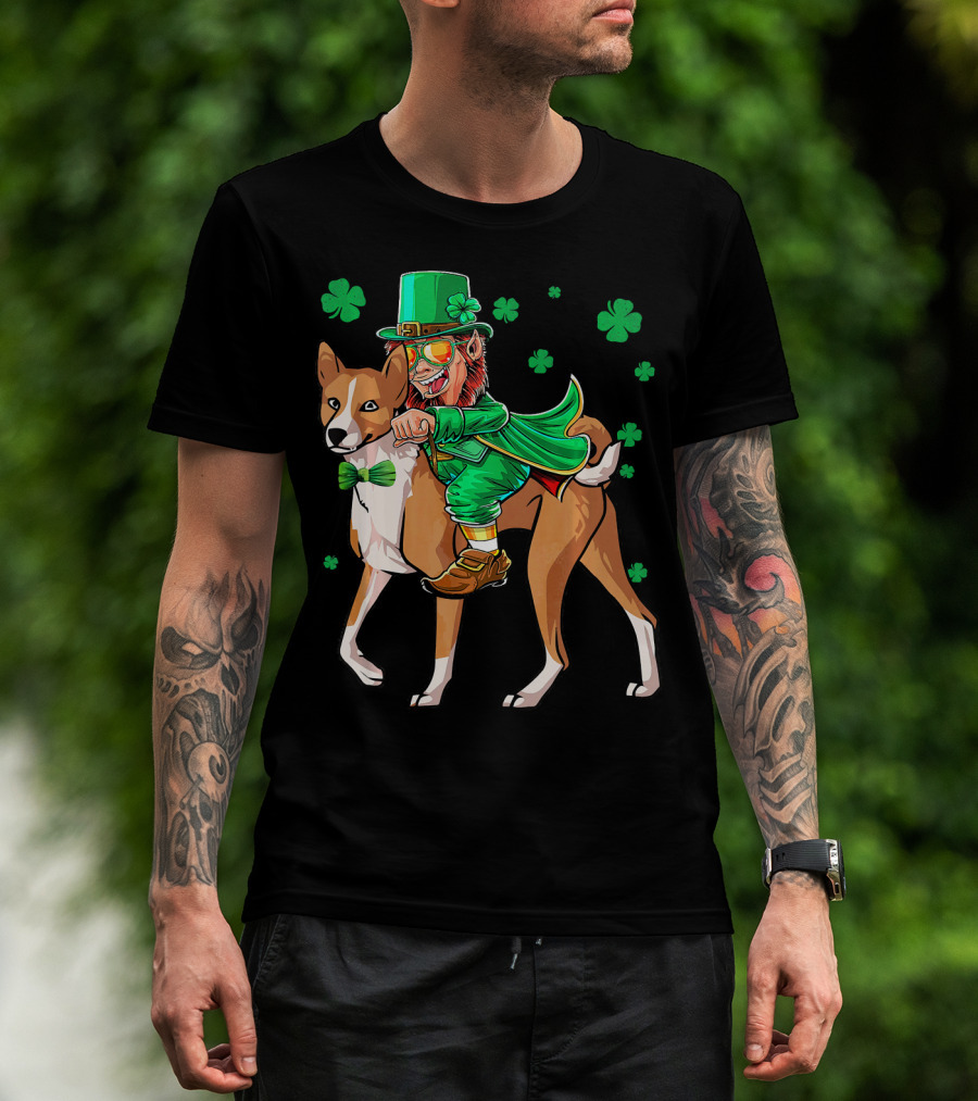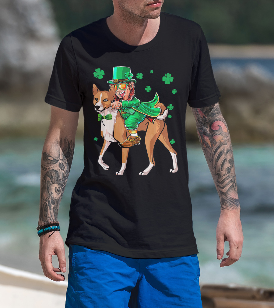 Leprechaun Riding Basenji With Shamrocks St Patricks T-Shirt