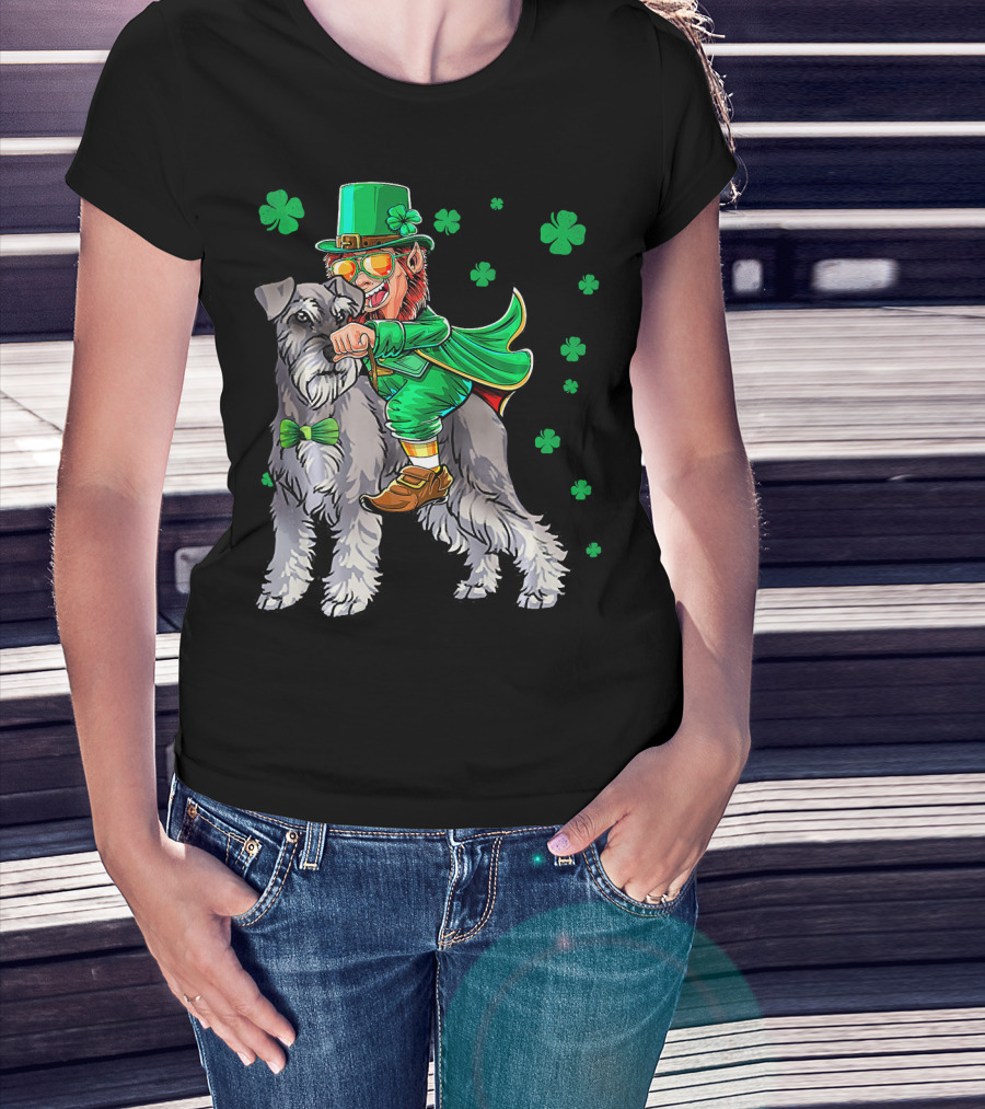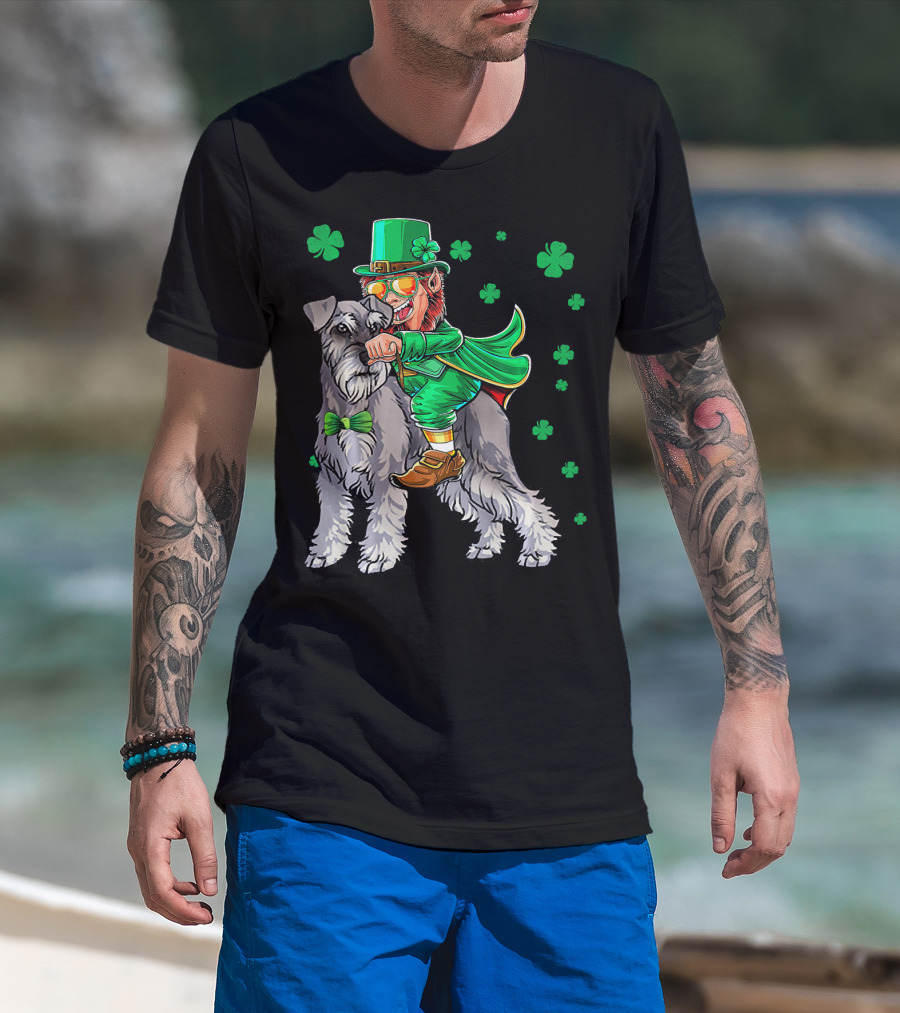 Leprechaun Riding Miniature Schnauzer With Green Shamrocks T-Shirt