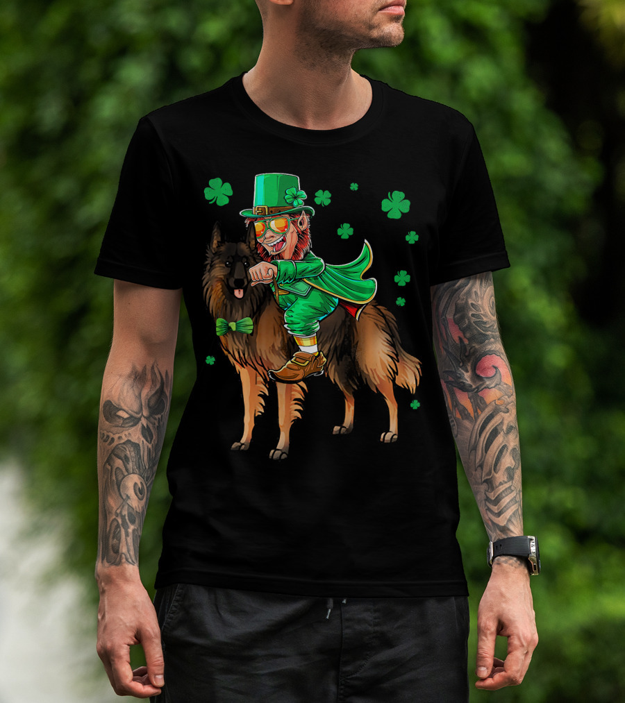 Leprechaun Riding Belgian Tervuren With Shamrock Accents T-Shirt