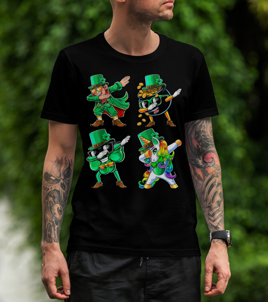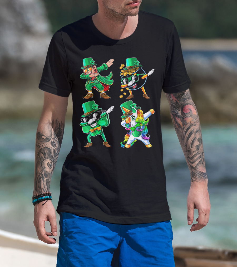 The Dabbing Leprechaun Shamrock Unicorn Coin-Throwing Glasses Rabbit T-shirt is designed for everyday wear and a consistent fit. Fabric is pre-shrunk ring-spun cotton with durable stitching. See the size chart below for exact measurements.