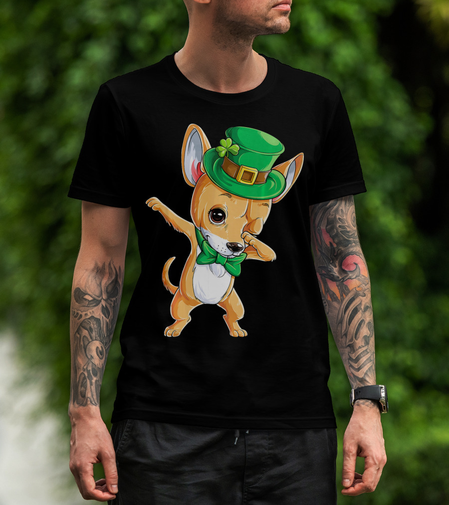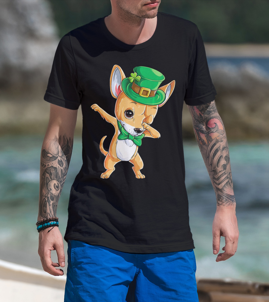 The St. Patrick's Day Dabbing Chihuahua Leprechaun Hat T-shirt is designed for everyday wear and a consistent fit. Fabric is pre-shrunk ring-spun cotton with durable stitching. See the size chart below for exact measurements.