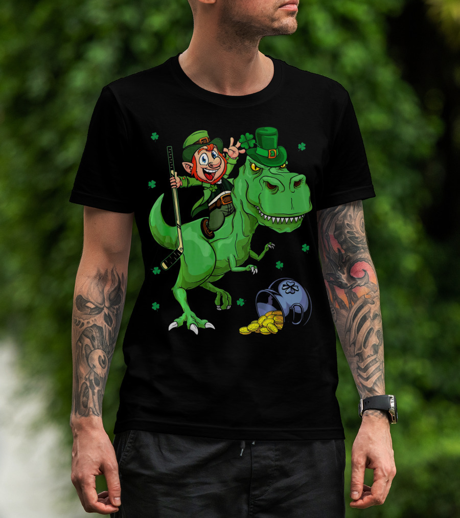 Funny St. Pat Rex Day Leprechaun Riding Dinosaur With Hockey Stick And Gold Coins T-Shirt
