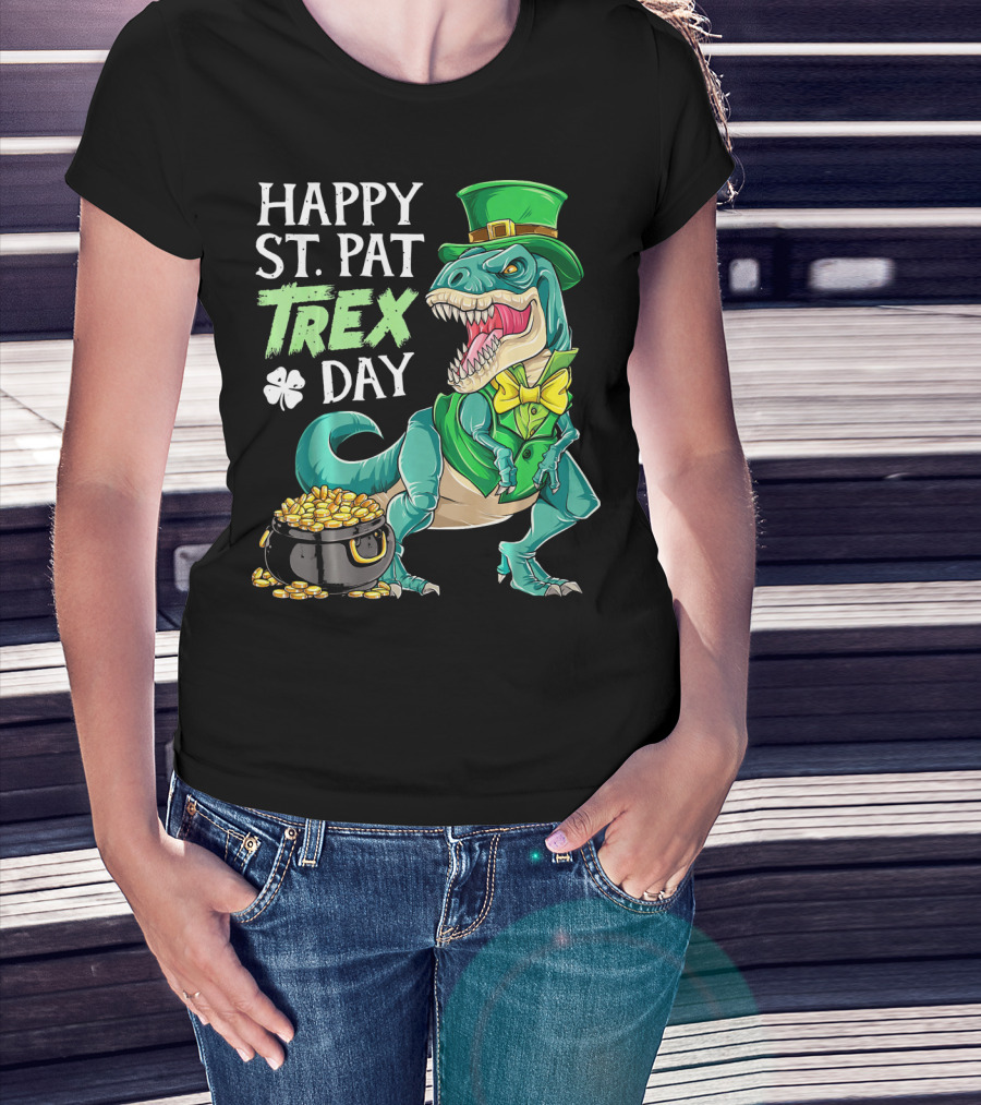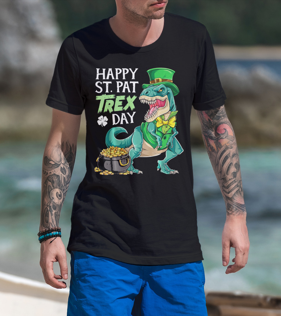 Happy St Pat Trex Day Leprechaun Dinosaur With Pot Of Gold And Clover T-Shirt
