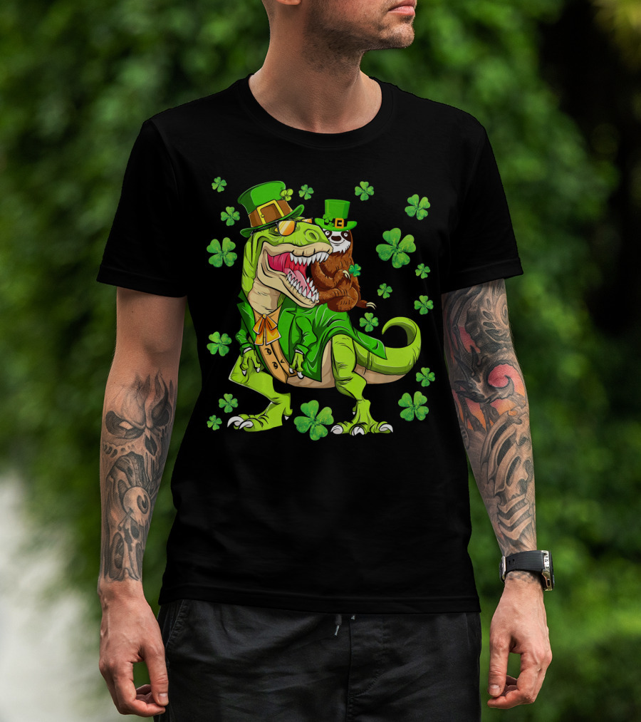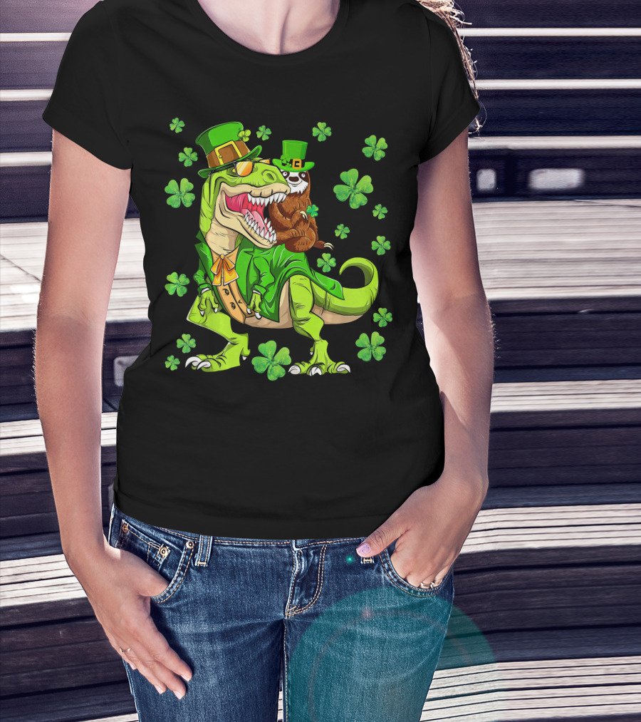 Leprechaun Sloth With Shamrocks Riding Dinosaur Rex In Green Attire T-Shirt