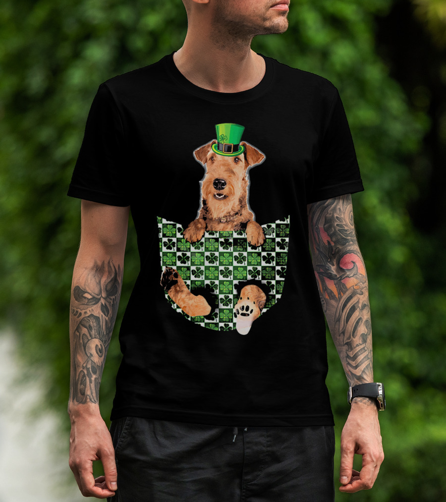 Airedale Terrier Pocket Patrick Hat Green Shamrocks T-Shirt