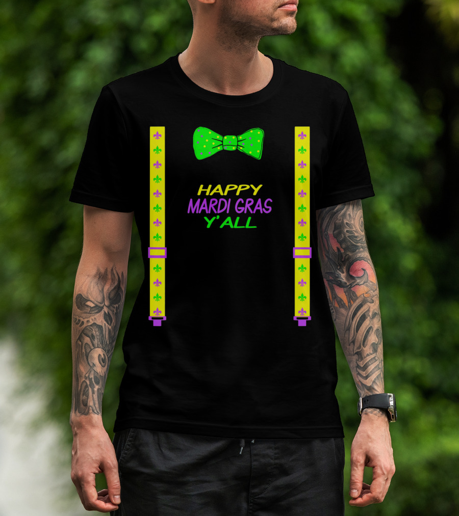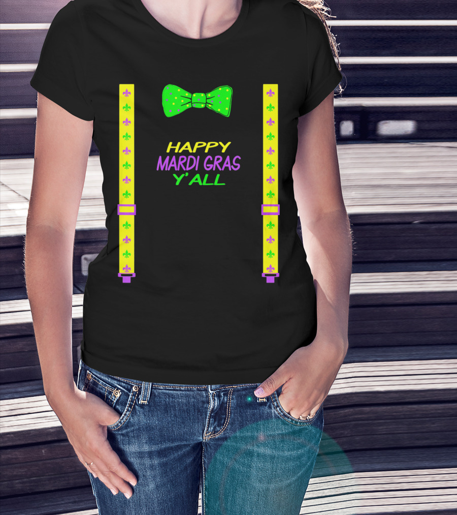 Happy Mardi Gras Y'all Colorful Bow Tie And Suspenders Fleur-de-Lis T-Shirt