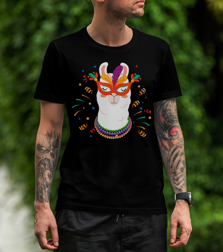 Llama Mardi Gras Mask Beads Festive T-Shirt