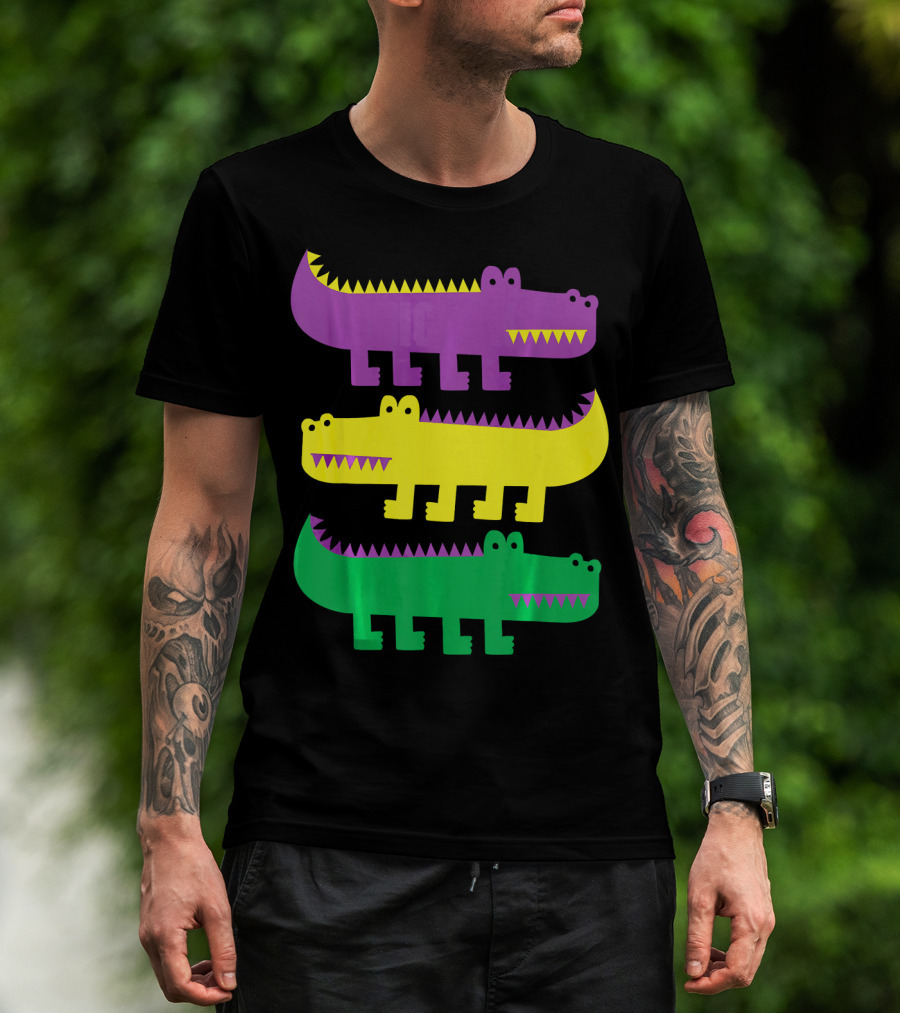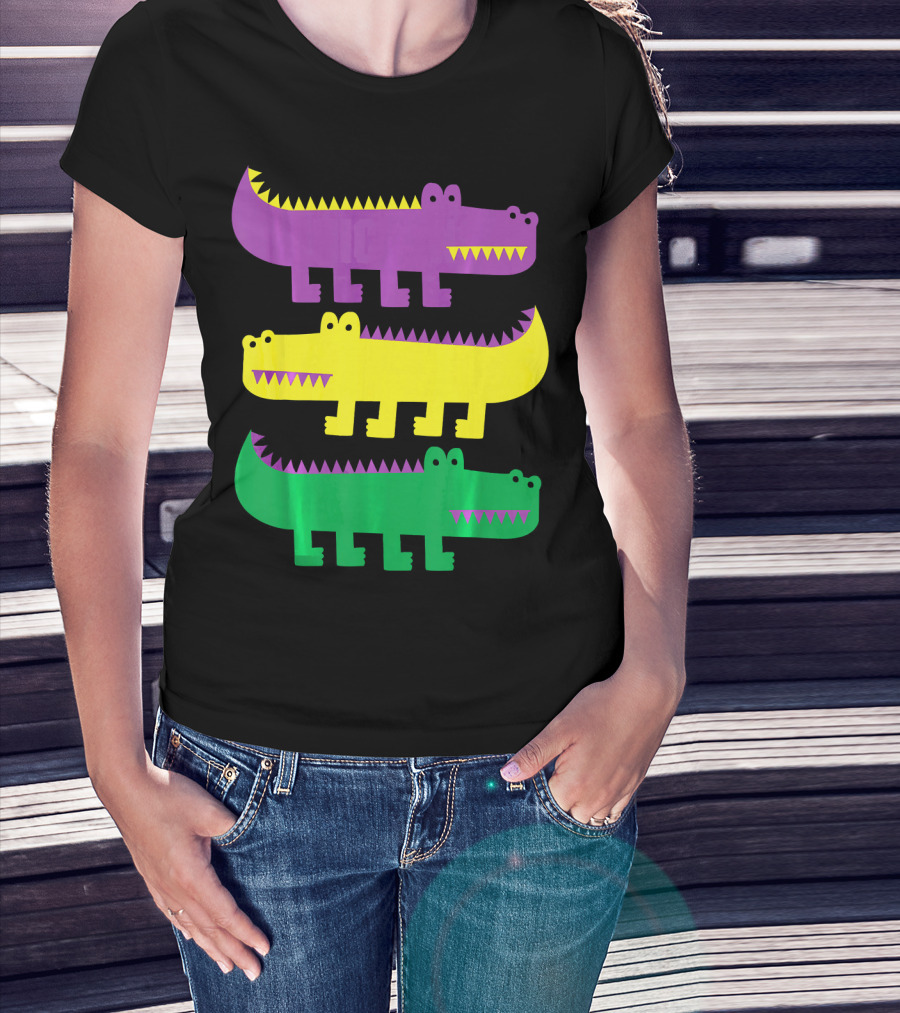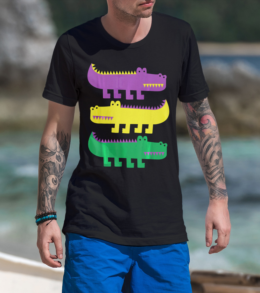 Mardi Gras Happy Alligator Crocodile Fun Purple Yellow Green Trio T-Shirt