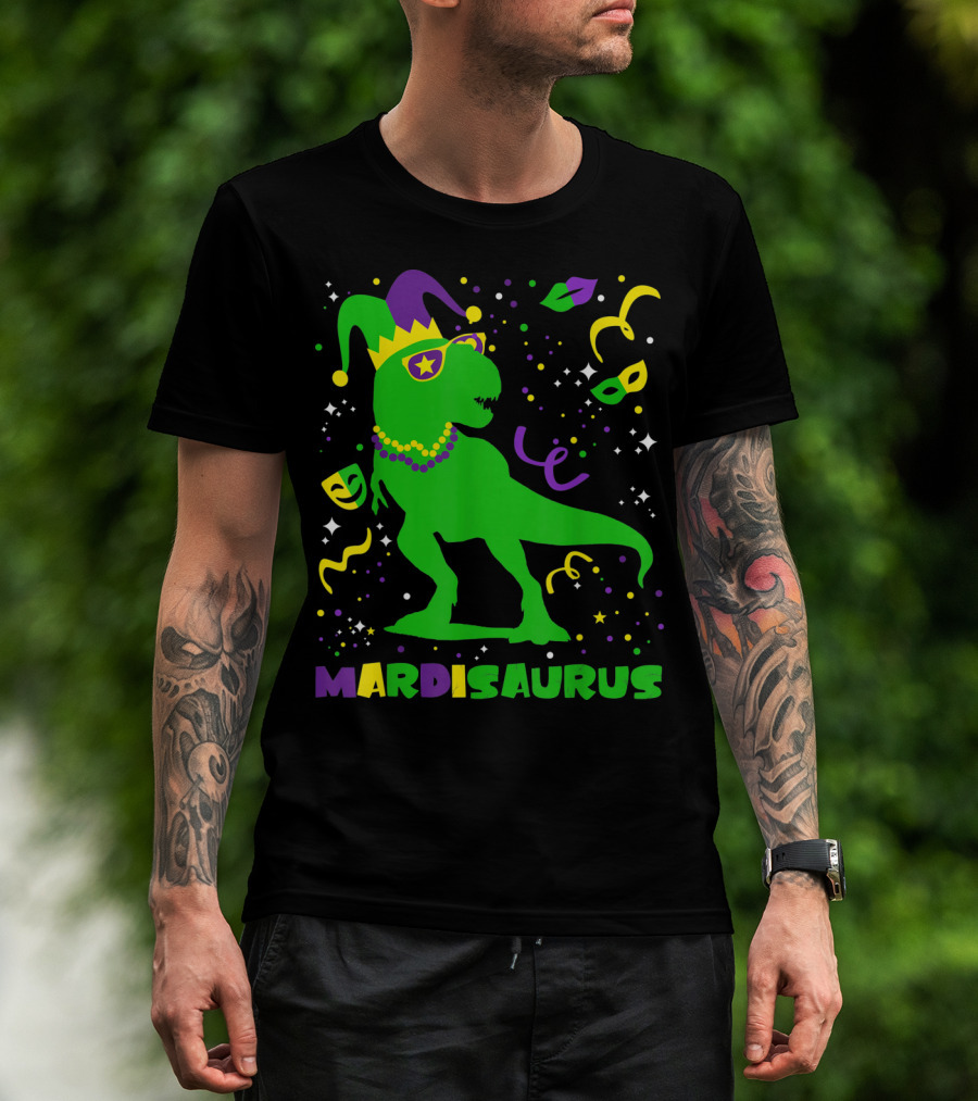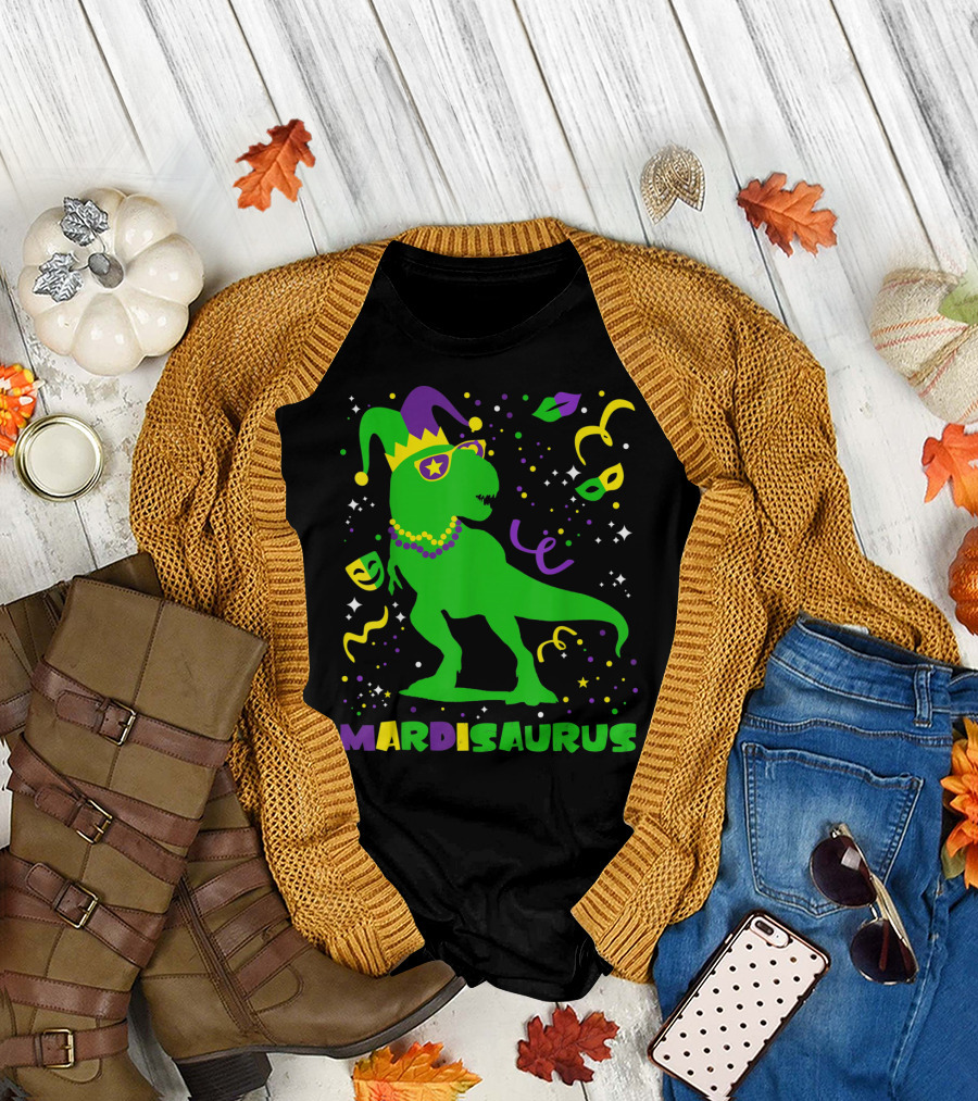 Mardi Gras Dinosaur Mardisaurus Jester Hat Beads Masks Party T-Shirt