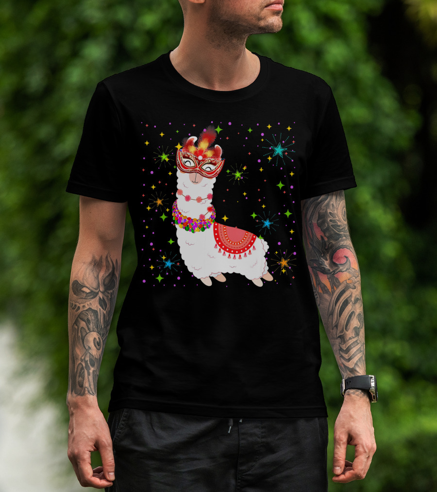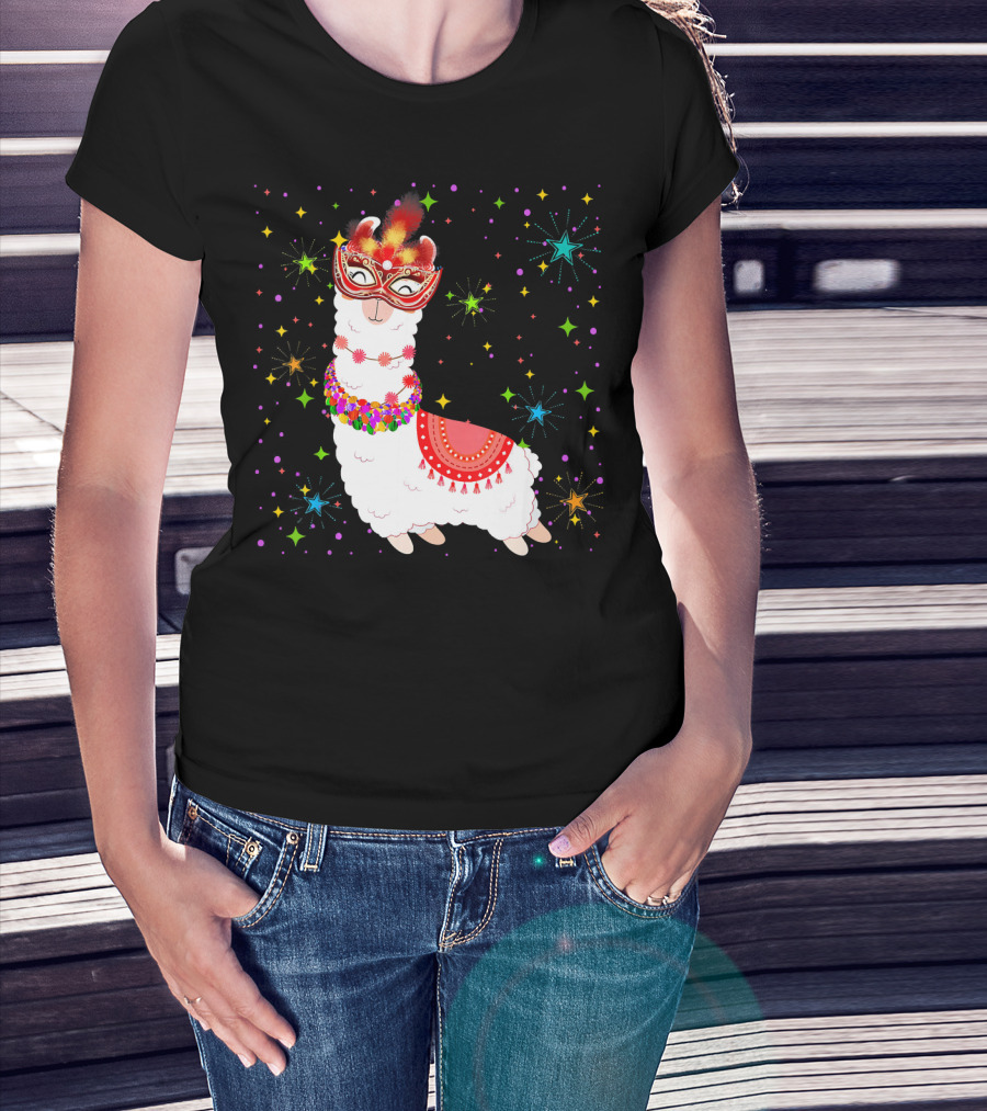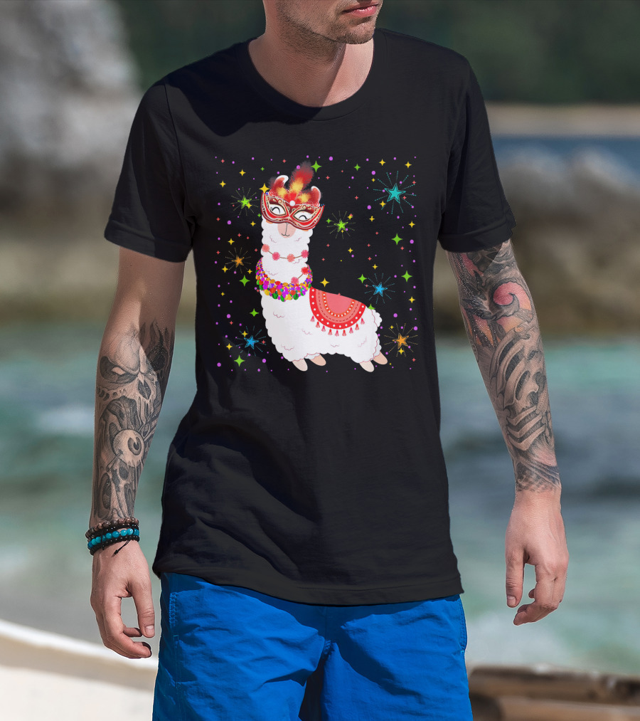 Llama Mardi Gras Mask Beads Colorful Festive Stars T-Shirt