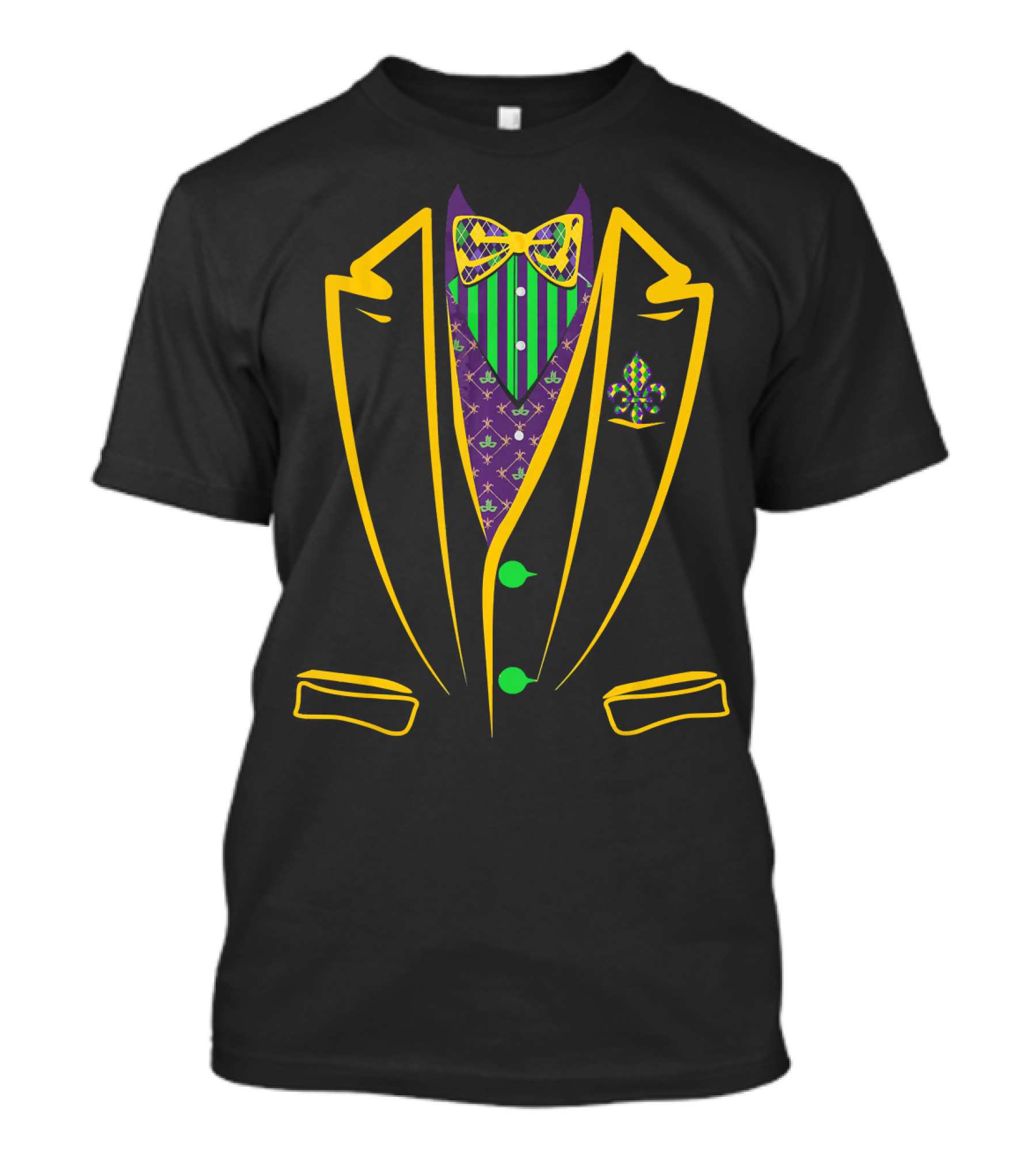 The Mardi Gras Tuxedo Costume Carnival Parade Vibrant Bow Tie and Fleur De Lis T-shirt is designed for everyday wear and a consistent fit. Fabric is pre-shrunk ring-spun cotton with durable stitching. See the size chart below for exact measurements.