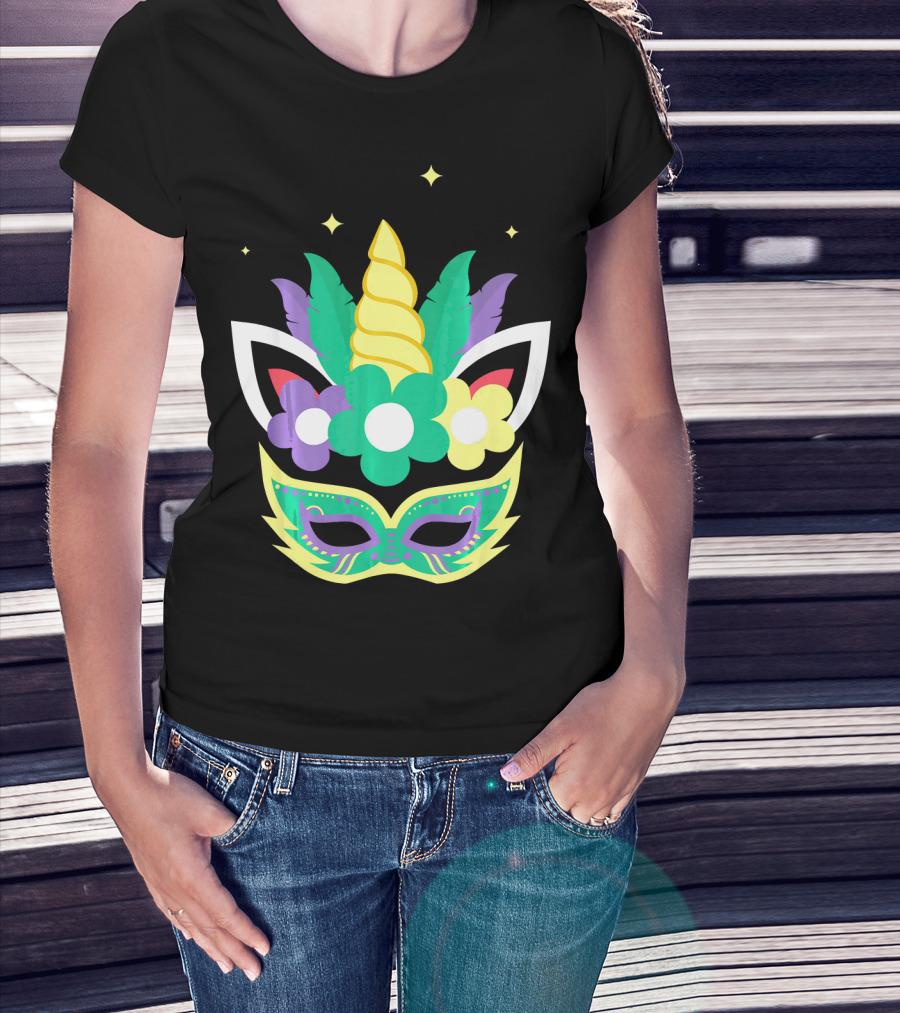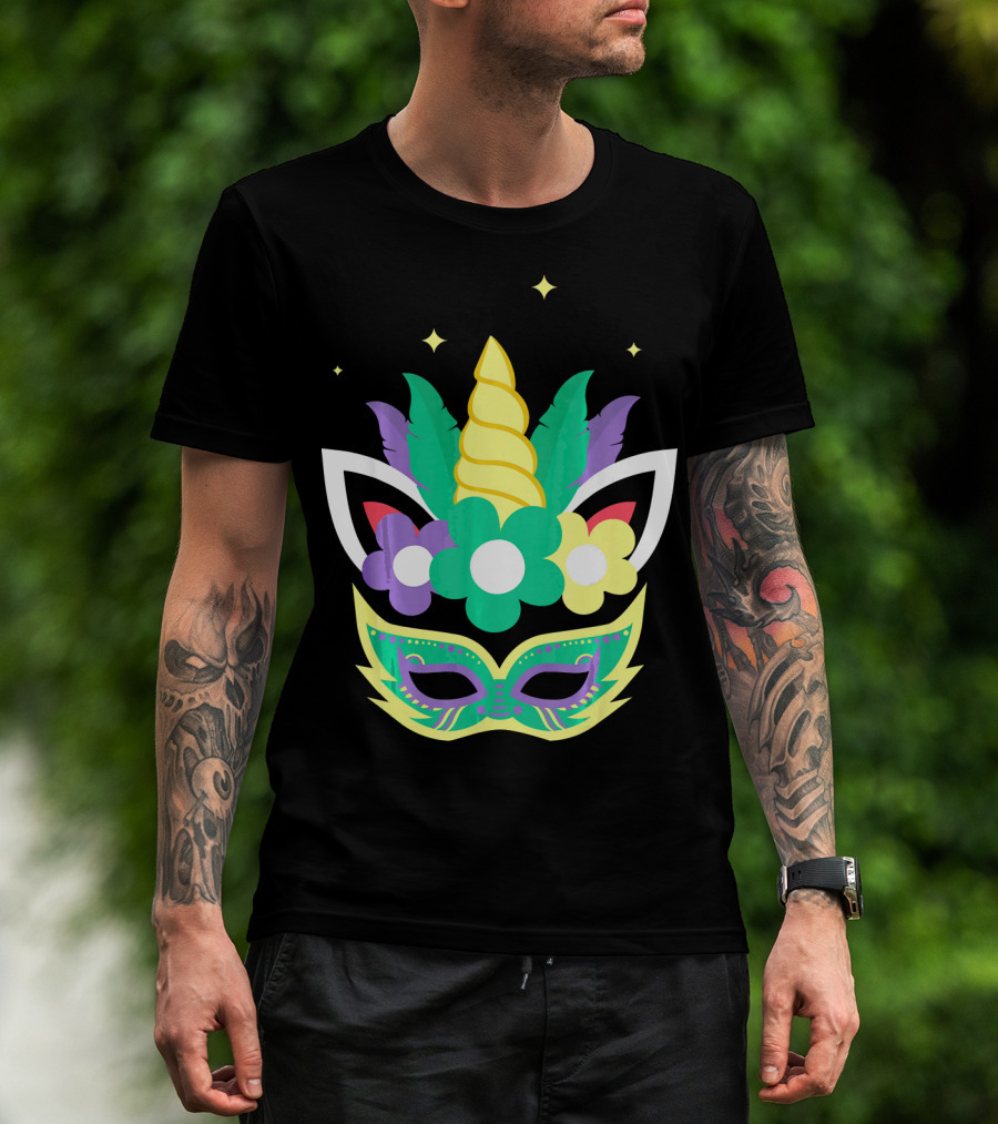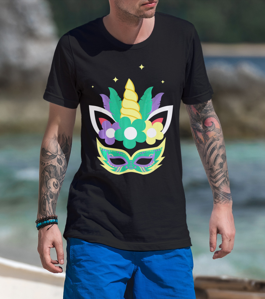 Unicorn Mardi Gras Mask With Flowers And Stars T-Shirt