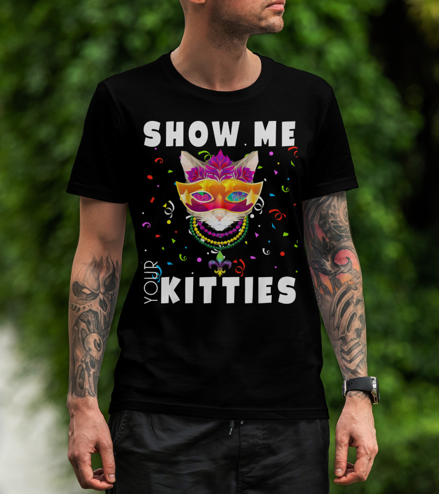 Show Me Your Kitties Mardi Gras Cat Mask And Beads Confetti T-Shirt