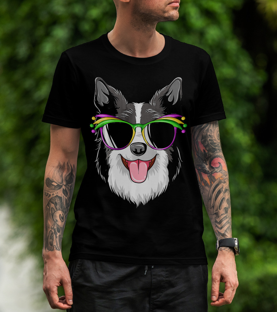 Collie Wearing Mardi Gras Carnival Mask With Colorful Glasses T-Shirt