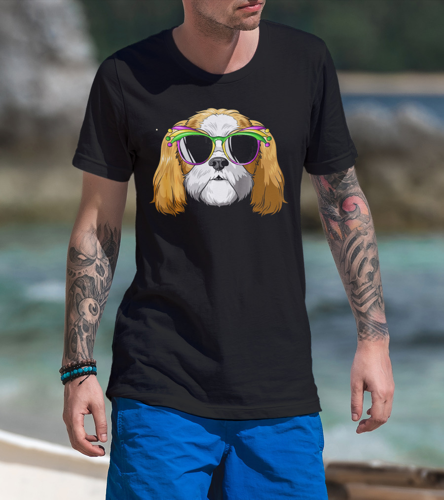Shih Tzu Wearing Colorful Mardi Gras Carnival Mask Glasses T-Shirt