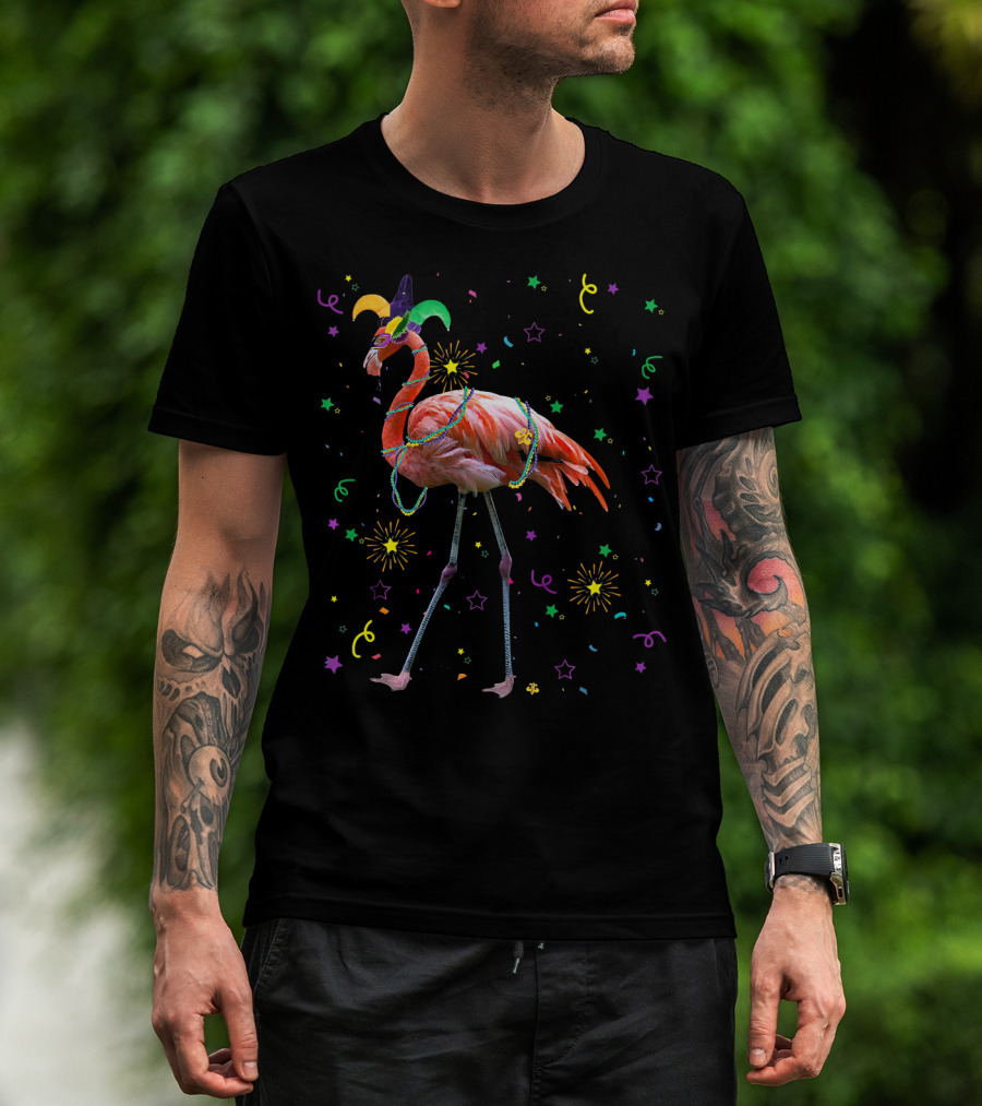 Flamingo Mardi Gras Carnival Festival Celebration With Jester Hat And Beads T-Shirt