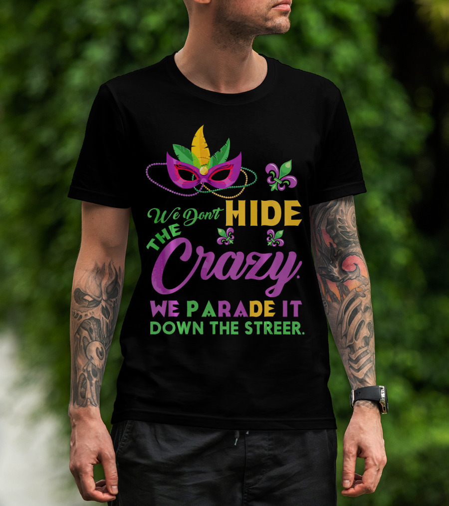 We Don't Hide The Crazy We Parade It Down The Street Mask And Beads Fleur De Lis Mardi Gras In New Orleans T-Shirt