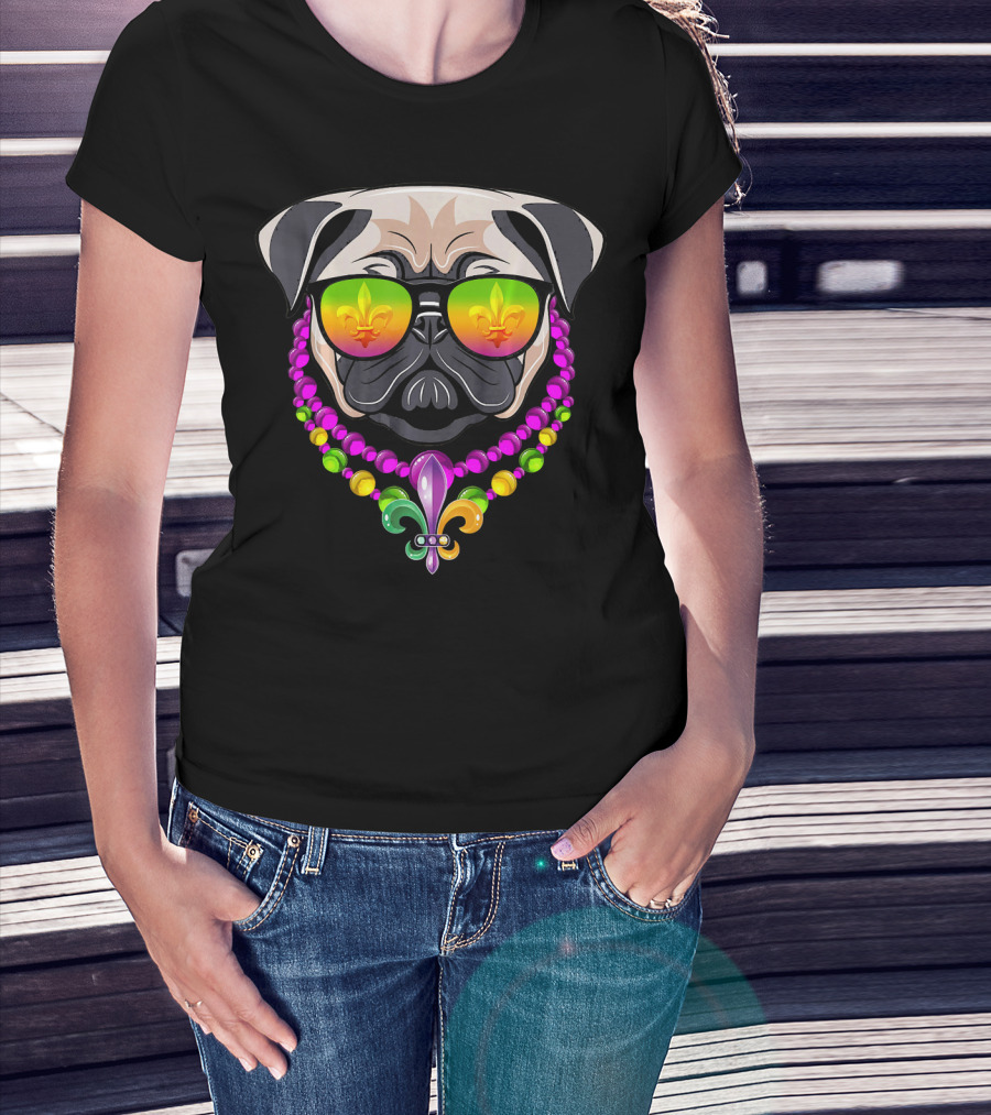 Mardi Gras Pug With Beads And Fleur-de-Lis Sunglasses T-Shirt