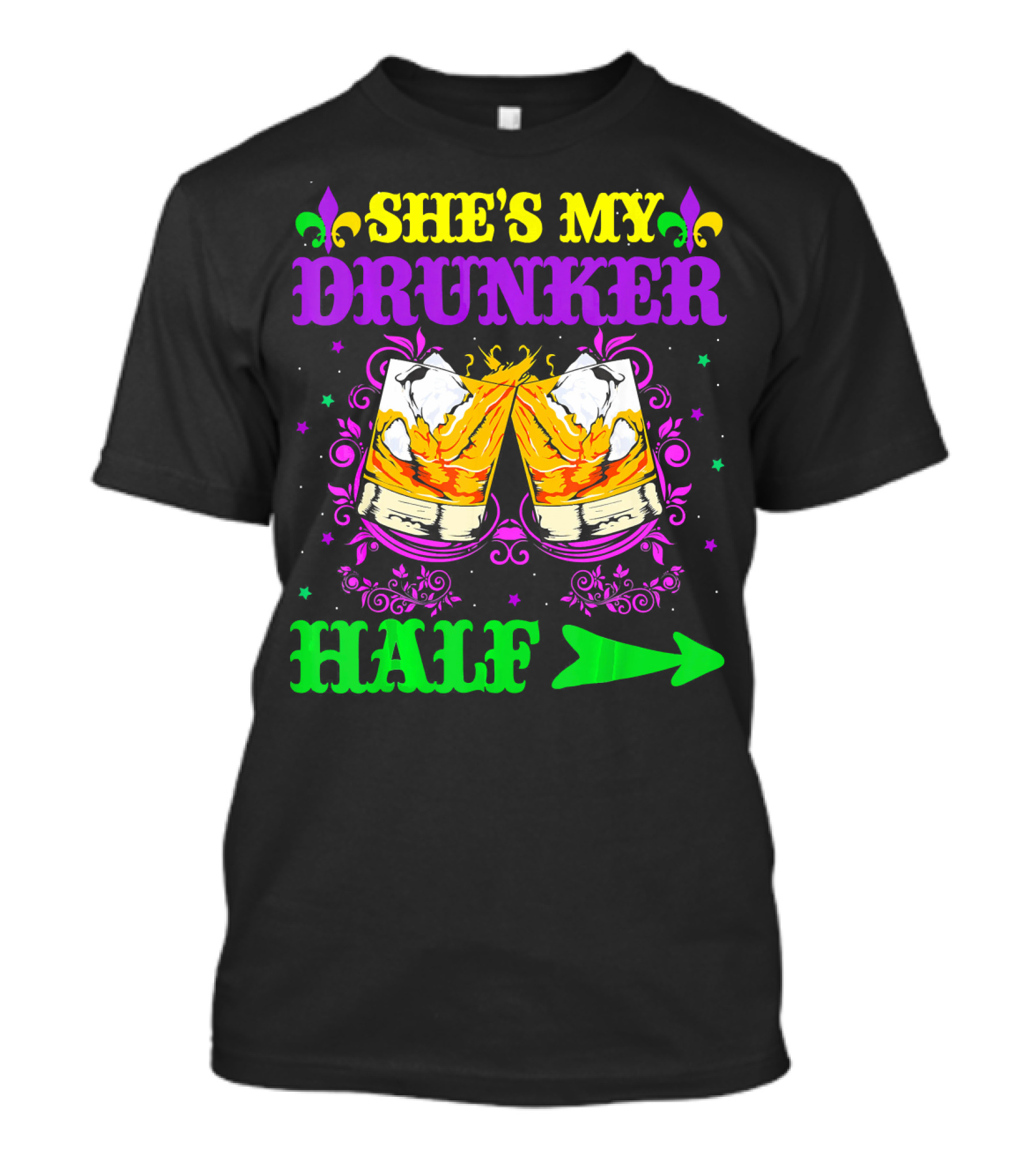The She's My Drunker Half Mardi Gras Co Cheers with Colorful Fleur-de-Lis and Clinking Glasses T-shirt is designed for everyday wear and a consistent fit. Fabric is pre-shrunk ring-spun cotton with durable stitching. See the size chart below for exact measurements.