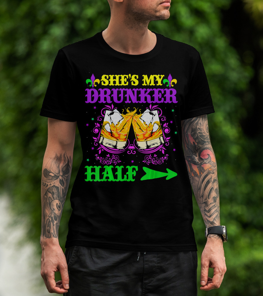 She's My Drunker Half Mardi Gras Co Cheers With Colorful Fleur-de-Lis And Clinking Glasses T-Shirt