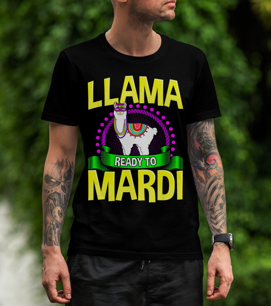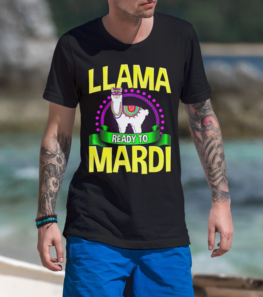 Llama Ready To Mardi Funny Llama Lover Festive Mask Beads Parade T-Shirt