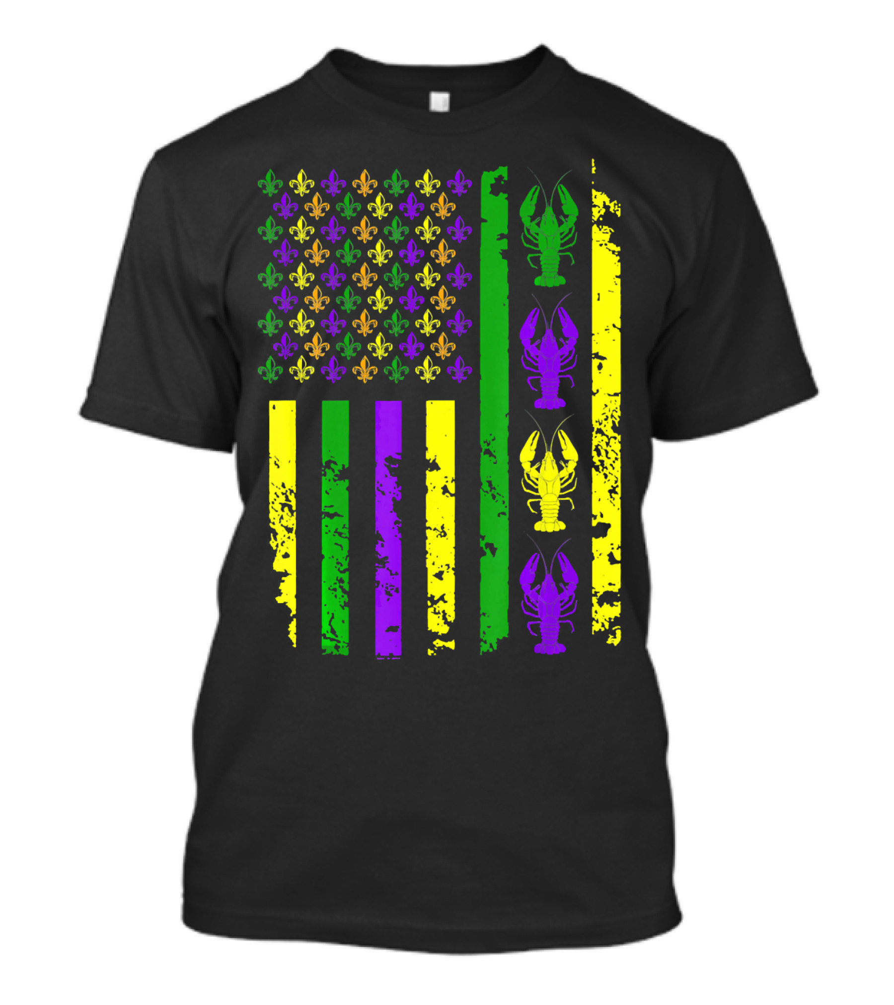 The American Flag Mardi Gras Fleur De Lis Crawfish T-shirt is designed for everyday wear and a consistent fit. Fabric is pre-shrunk ring-spun cotton with durable stitching. See the size chart below for exact measurements.