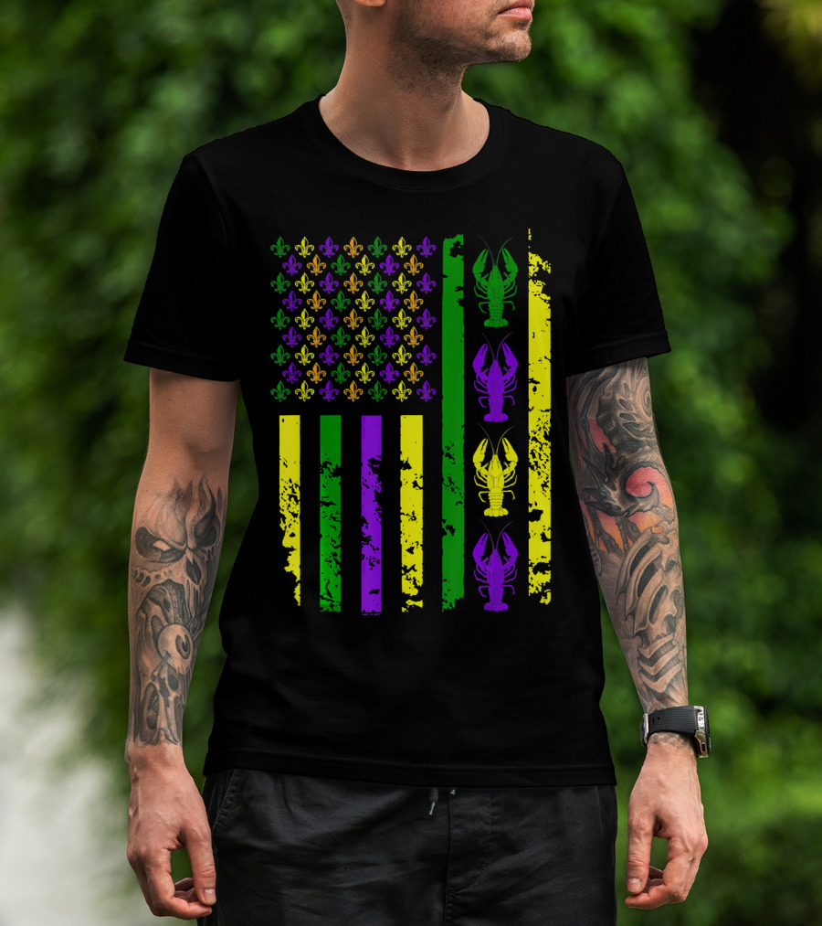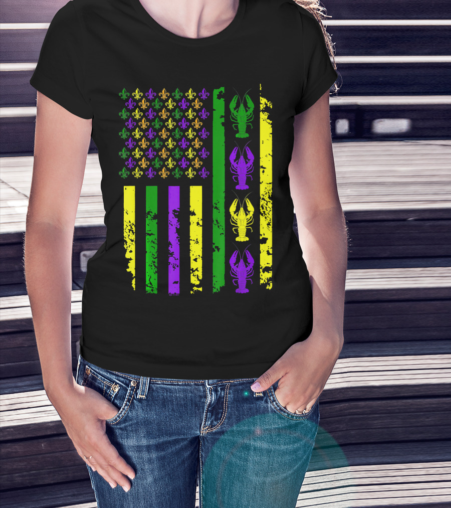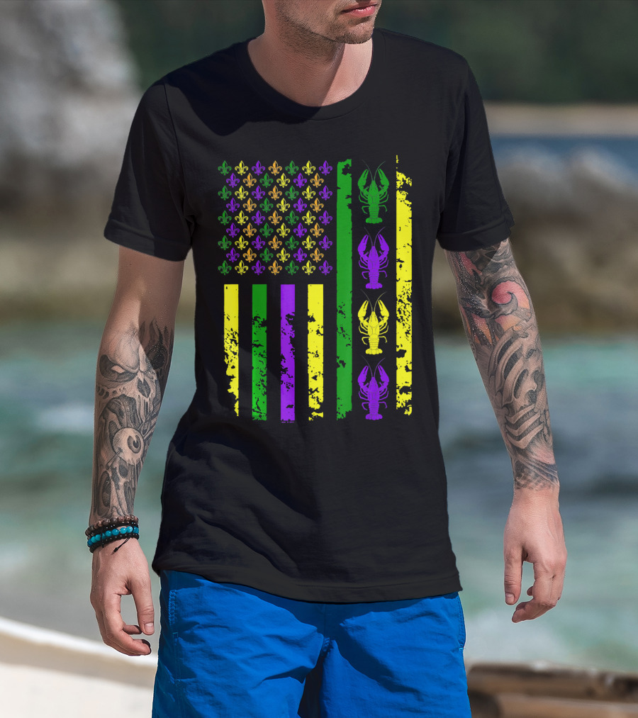 American Flag Mardi Gras Fleur De Lis Crawfish T-Shirt
