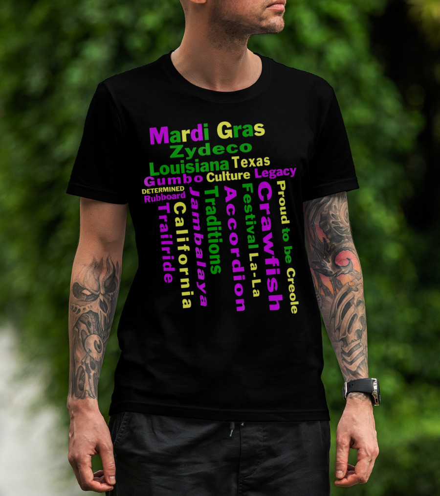 The Mardi Gras Zydeco Louisiana Texas Gumbo Culture Traditions Accordion Crawfish Trailride Jambalaya Creole T-shirt is designed for everyday wear and a consistent fit. Fabric is pre-shrunk ring-spun cotton with durable stitching. See the size chart below for exact measurements.