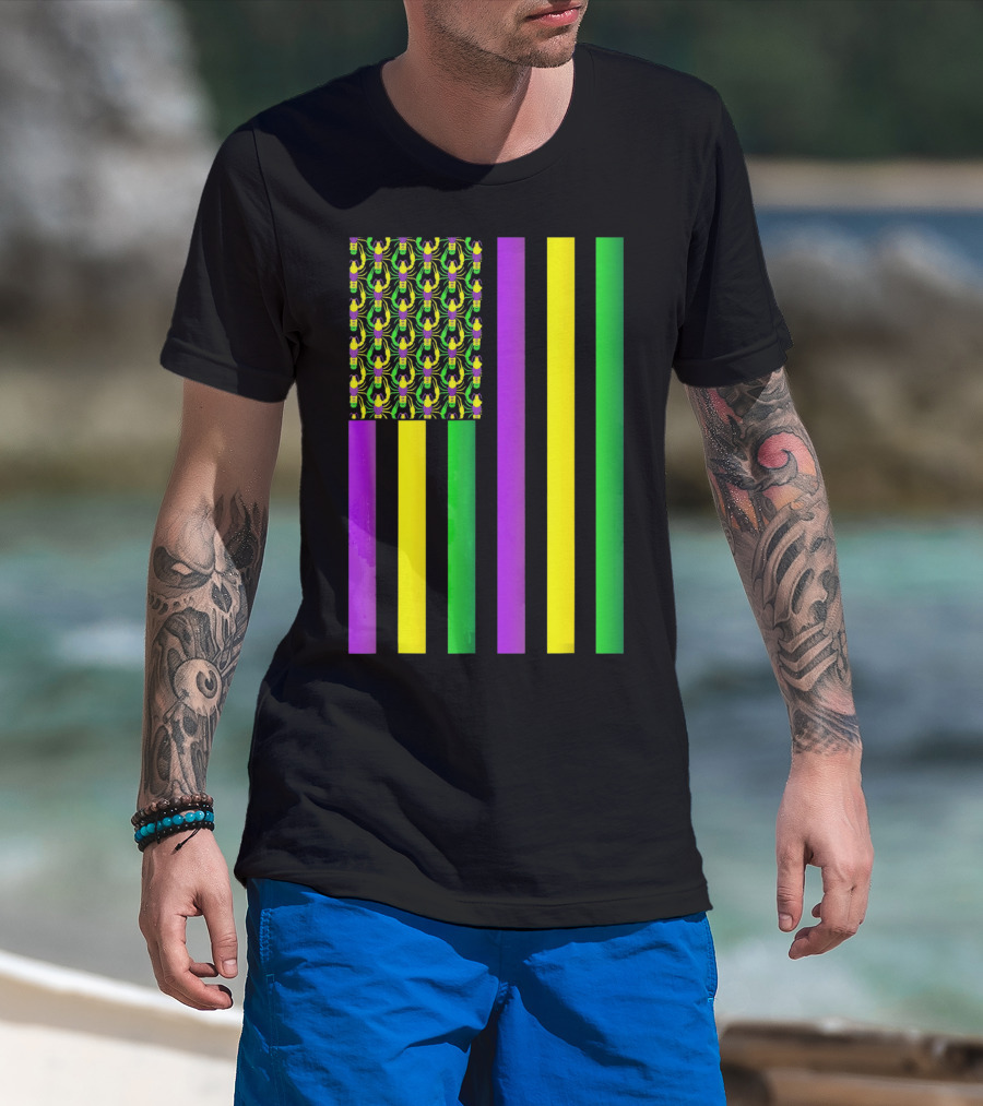 Usa Flag Mardi Gras Crawfish Purple Yellow Green Stripes T-Shirt
