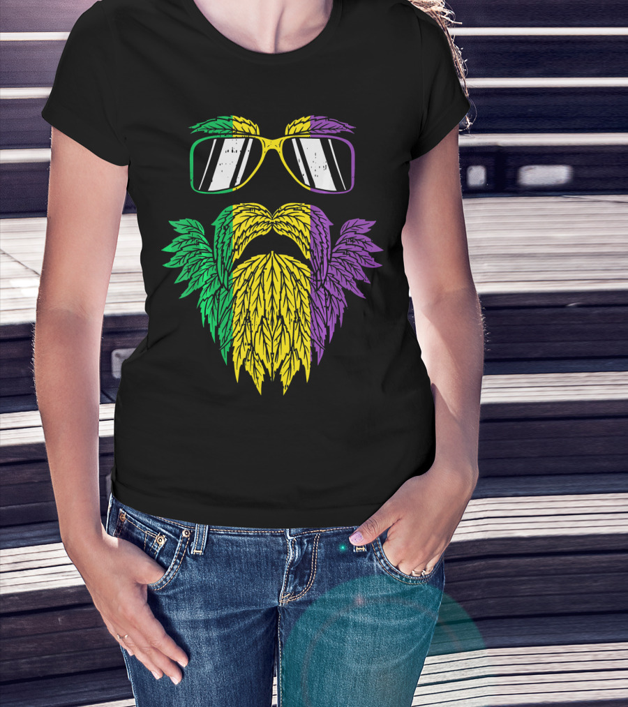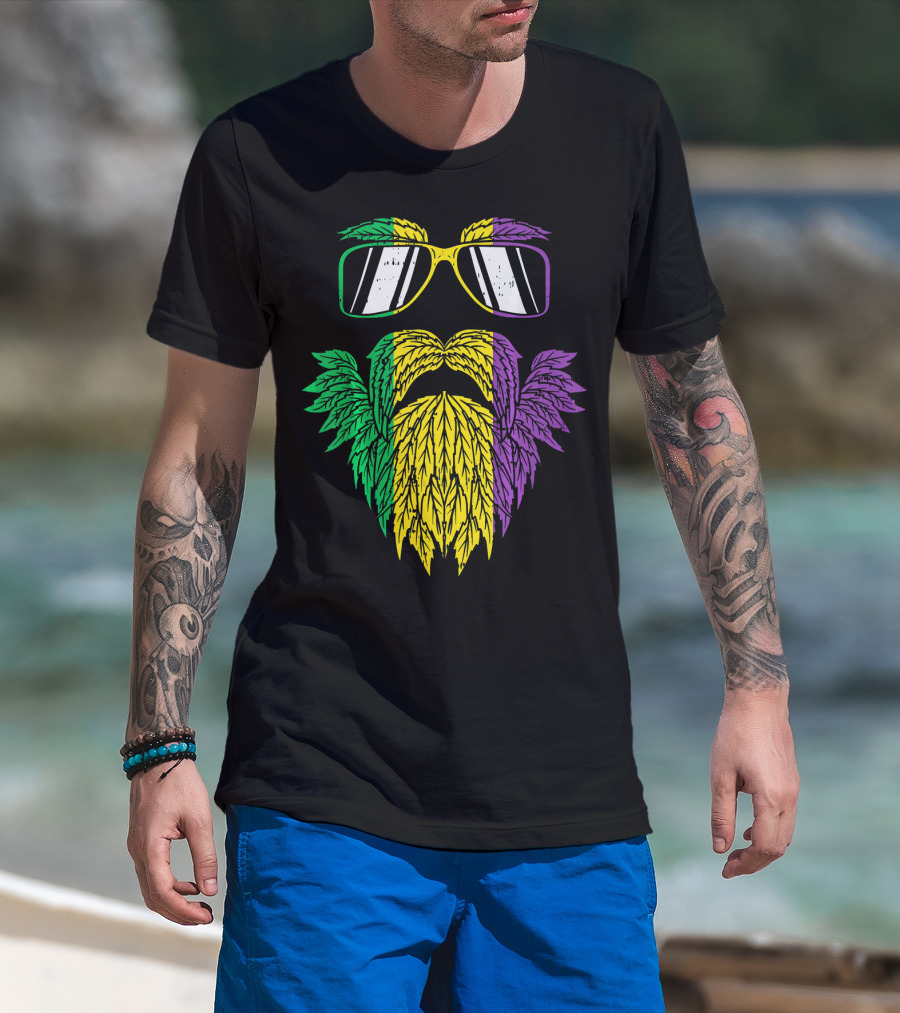 Purple Green Yellow Beard Sunglasses Mardi Gras Hipster T-Shirt