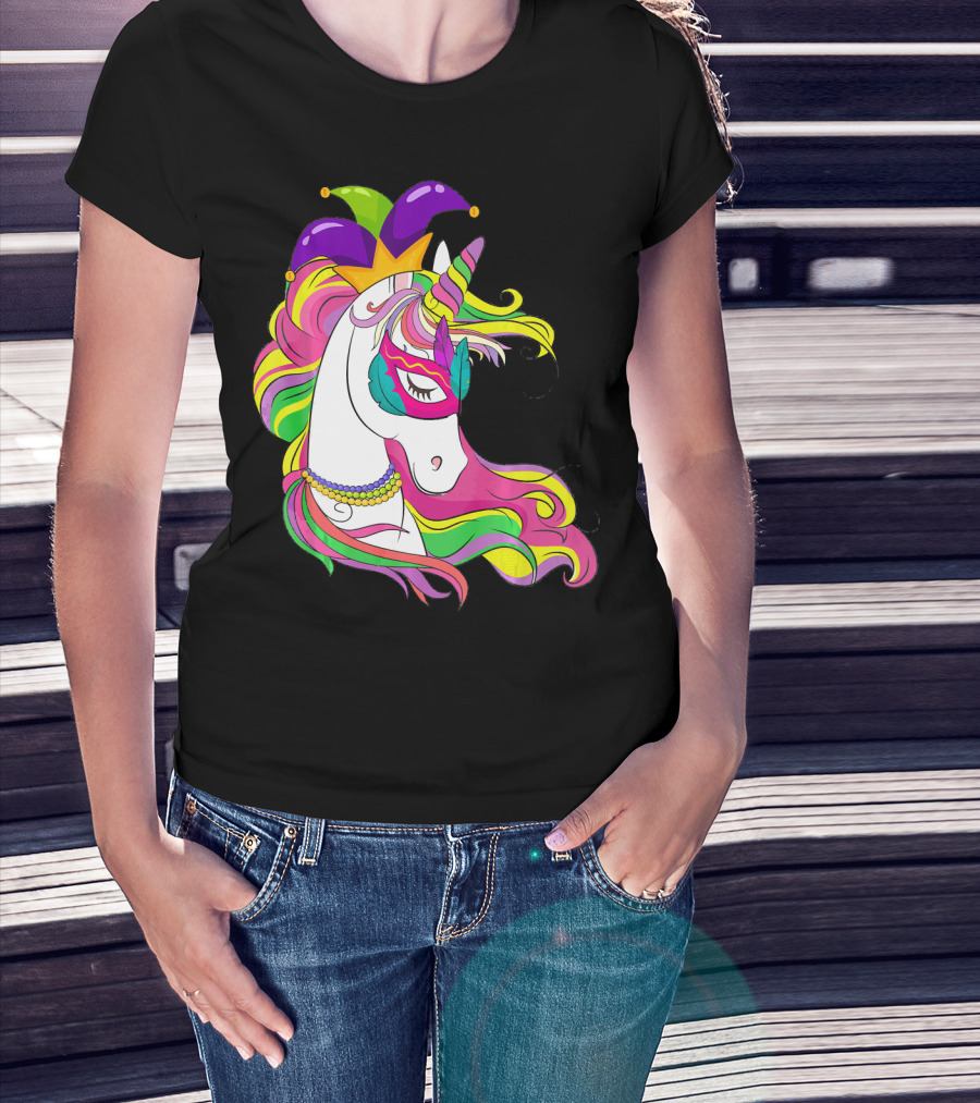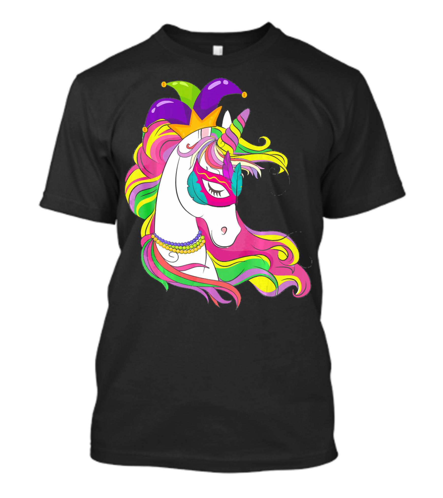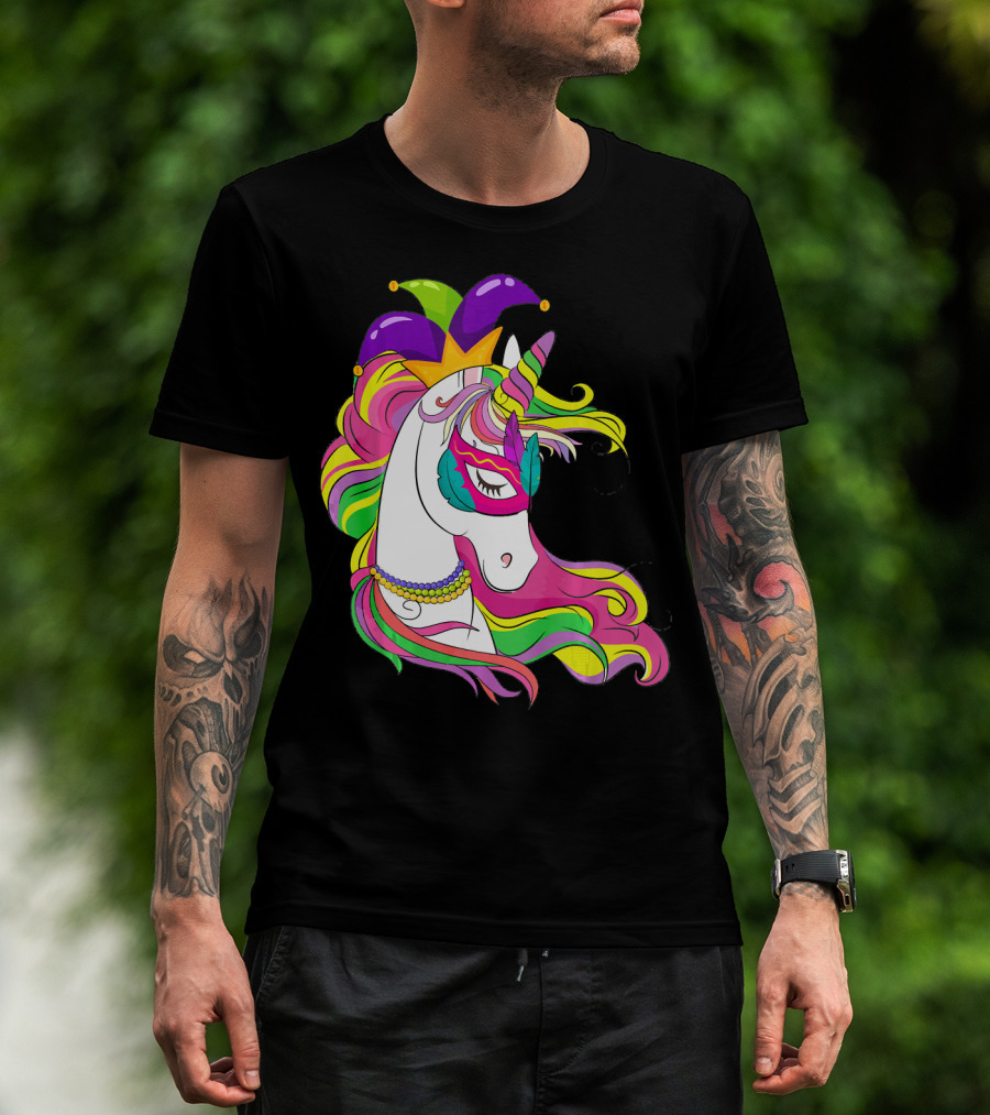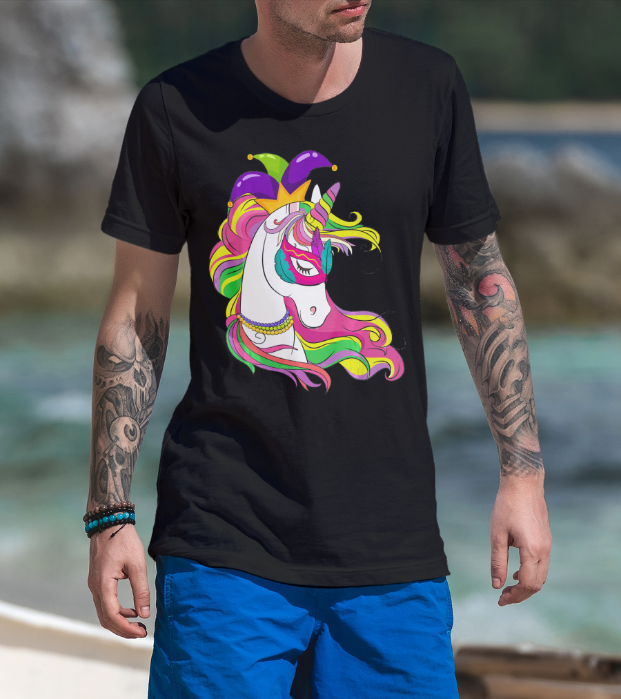 Mardi Gras Jester Unicorn With Rainbow Mask And Colorful Mane T-Shirt