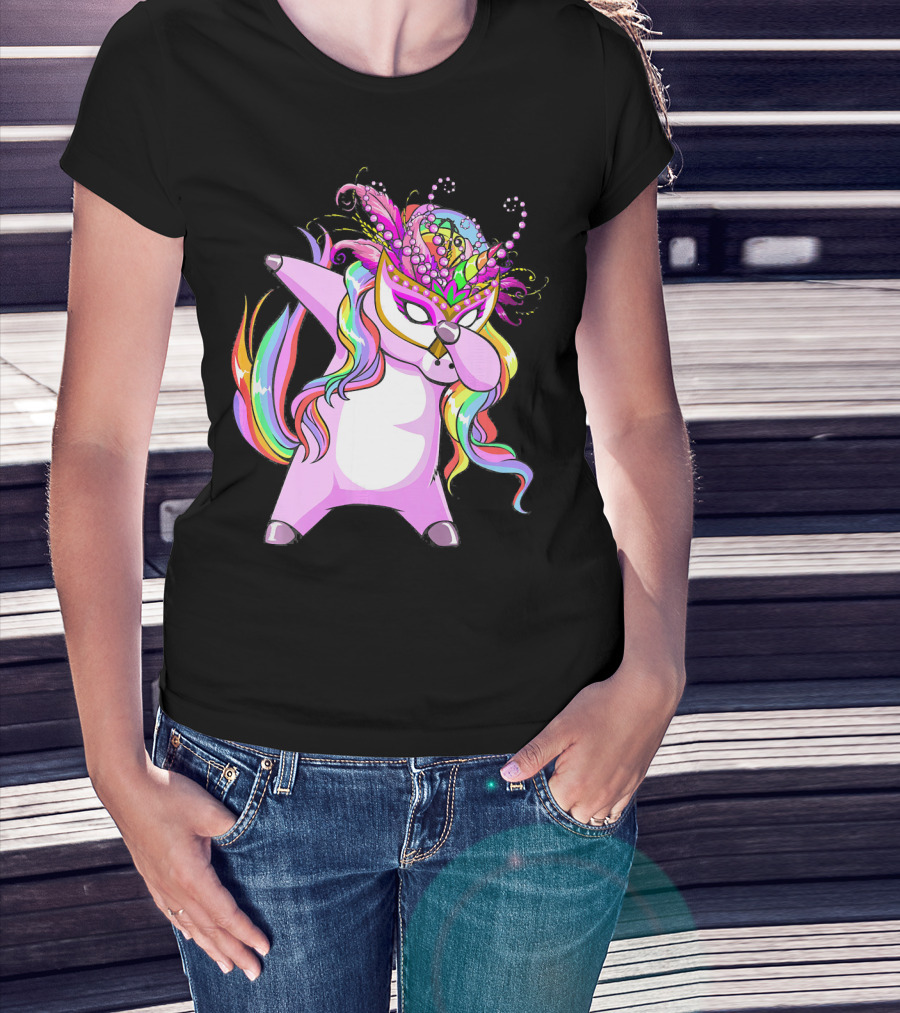 Dabbing Mardi Gras Masked Unicorn With Colorful Mane T-Shirt
