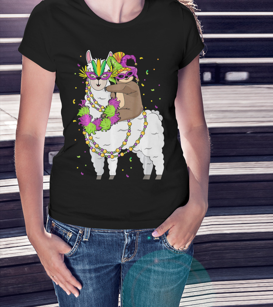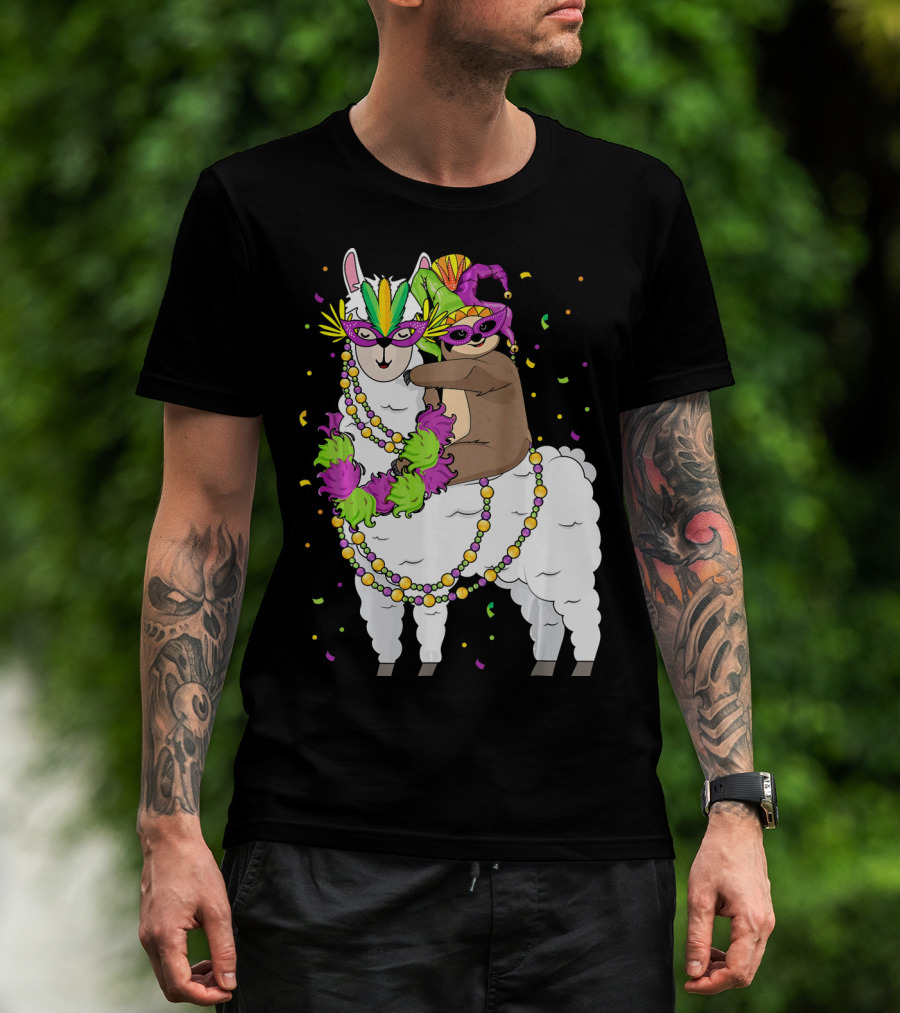 Llama Masked With Beads And Confetti Sloth Mardi Gras T-Shirt