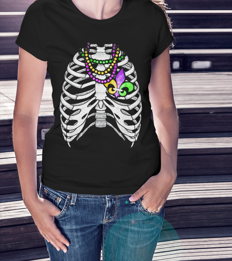 Mardi Gras Beads Skeleton Fleur De Lis Ribcage Heart T-Shirt