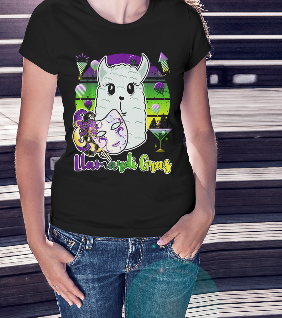 Llamardi Gras Mardi Gras Carnival Mask And Llama With Cocktail And Party Elements T-Shirt