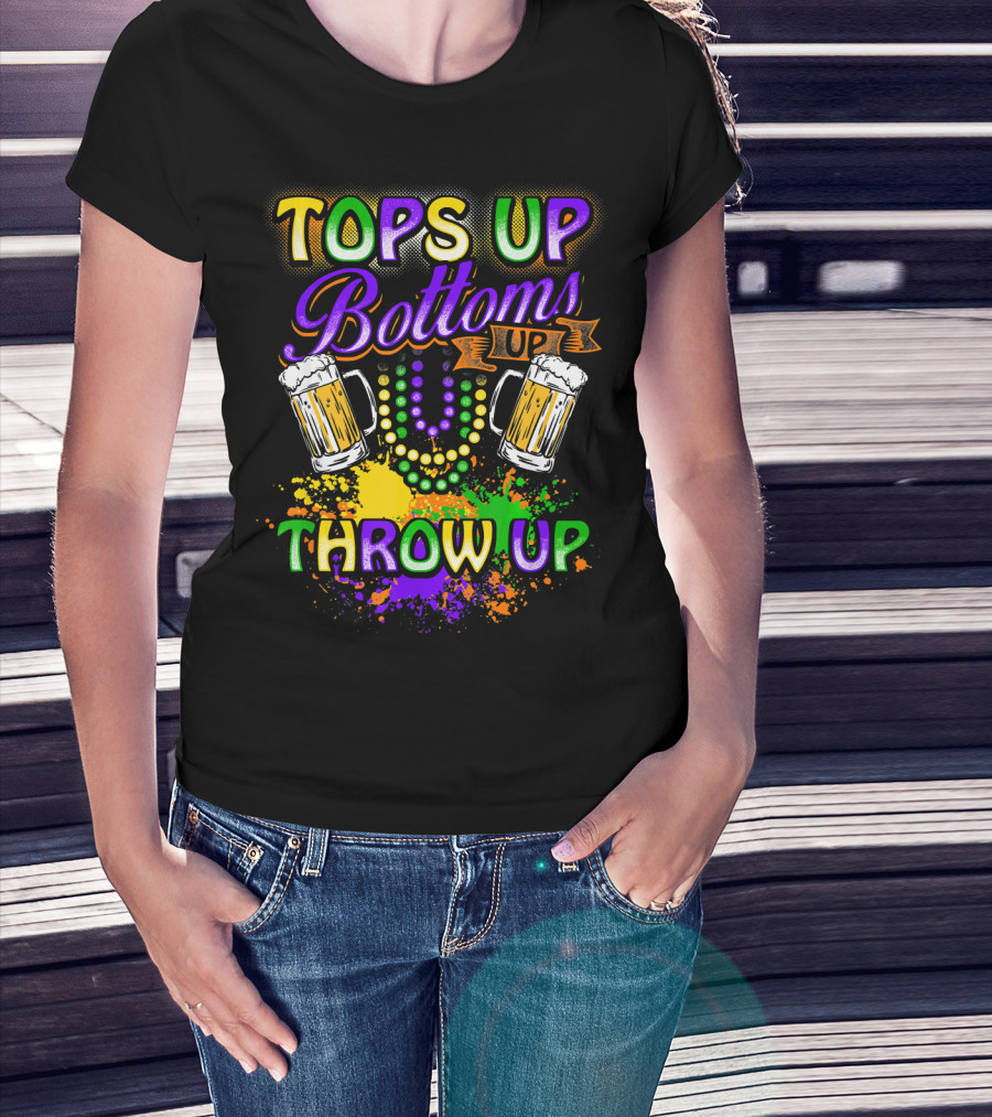 Mardi Gras Tops Up Bottoms Up Throw Up Beer Mugs Colorful Splatter T-Shirt