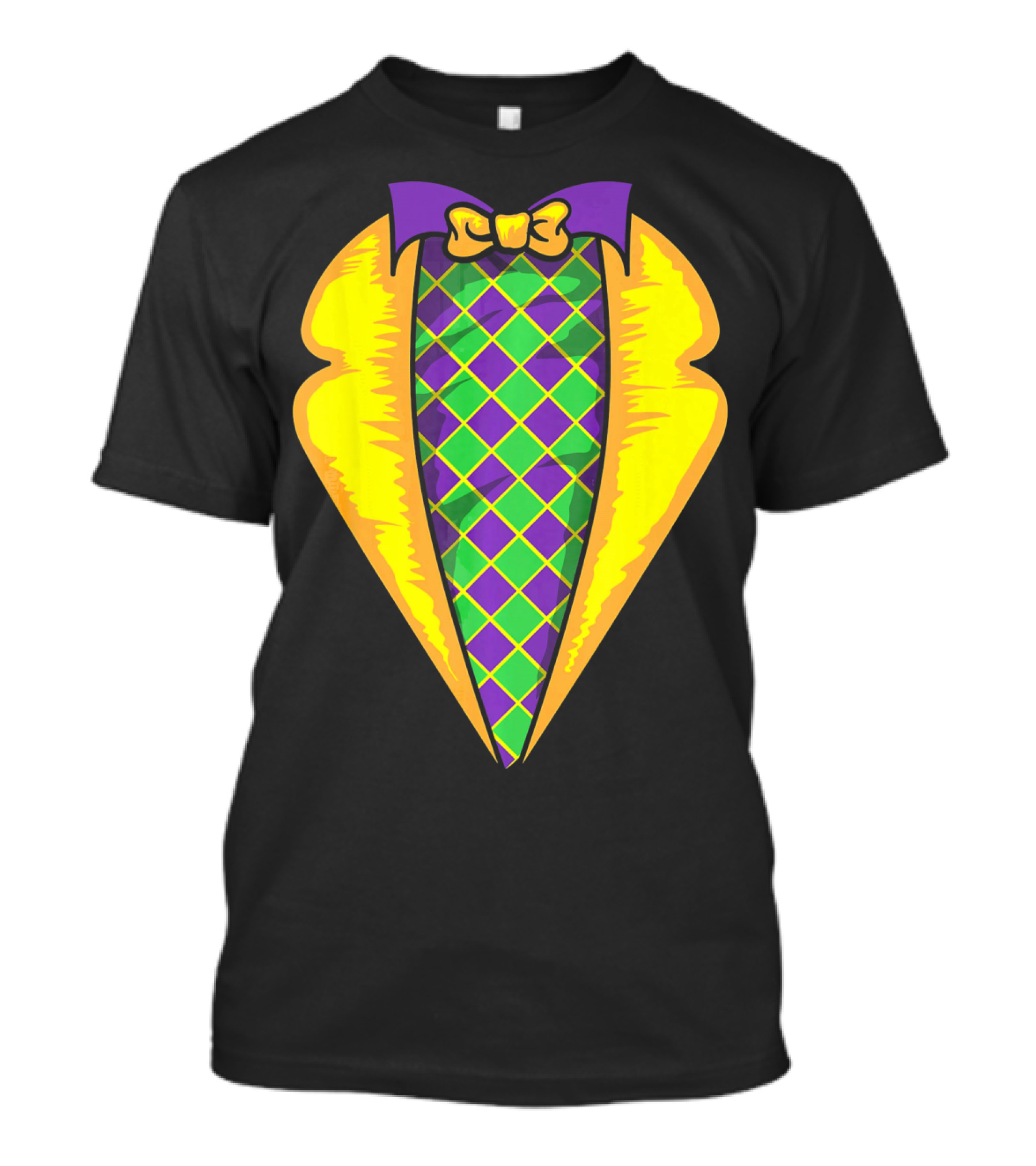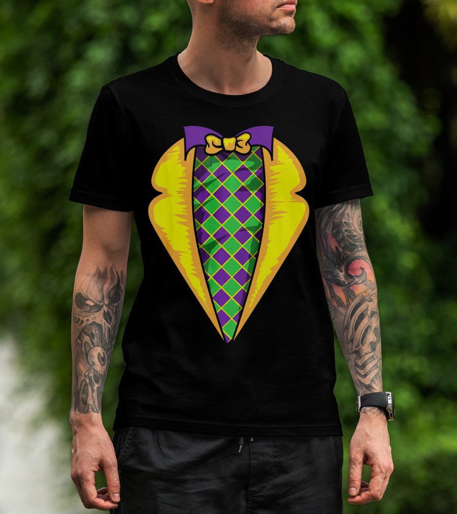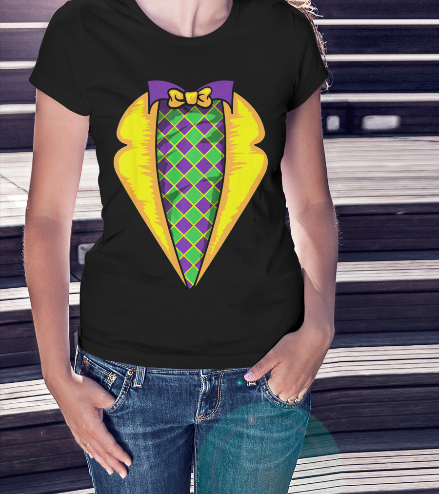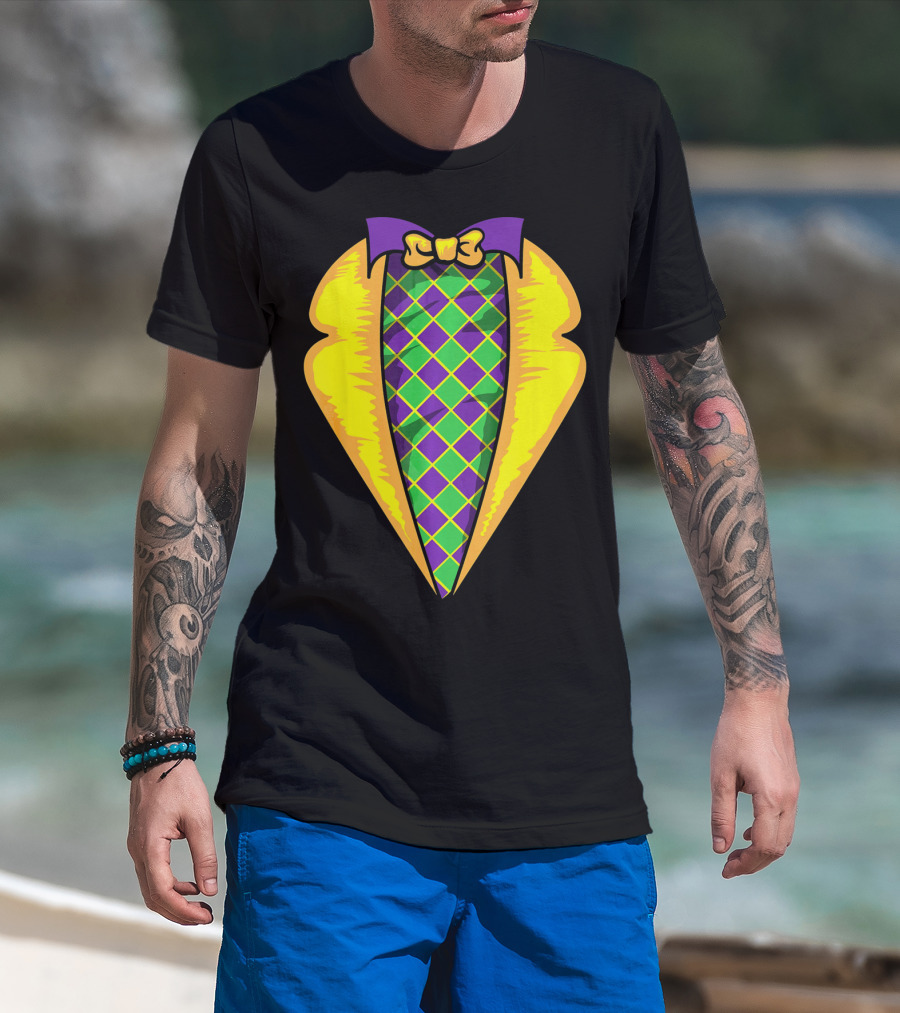 Mardi Gras Tuxedo Costume Yellow Purple Bow Tie Checker T-Shirt