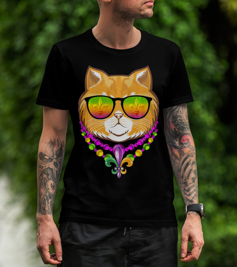 Mardi Gras Cat With Beads And Fleur-de-Lis Sunglasses T-Shirt