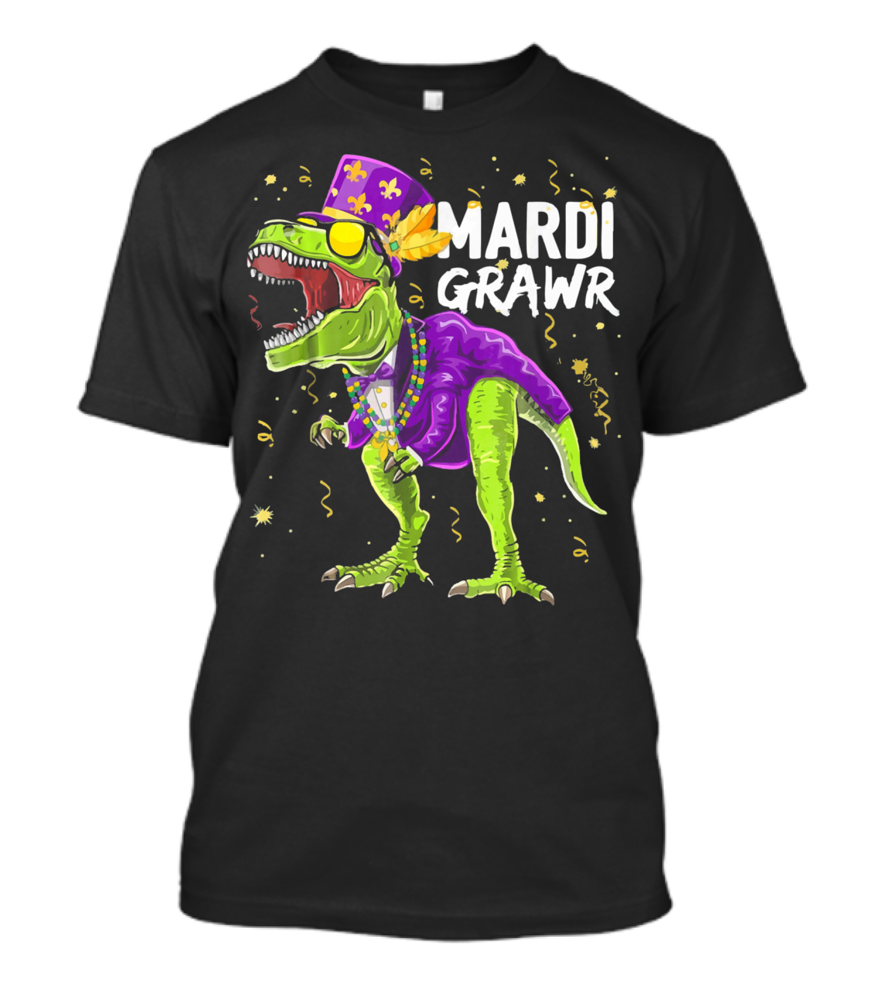 The Mardi Gras Dinosaur Mardi Grawr Carnival Roaring T-Rex with Beads and Hat T-shirt is designed for everyday wear and a consistent fit. Fabric is pre-shrunk ring-spun cotton with durable stitching. See the size chart below for exact measurements.