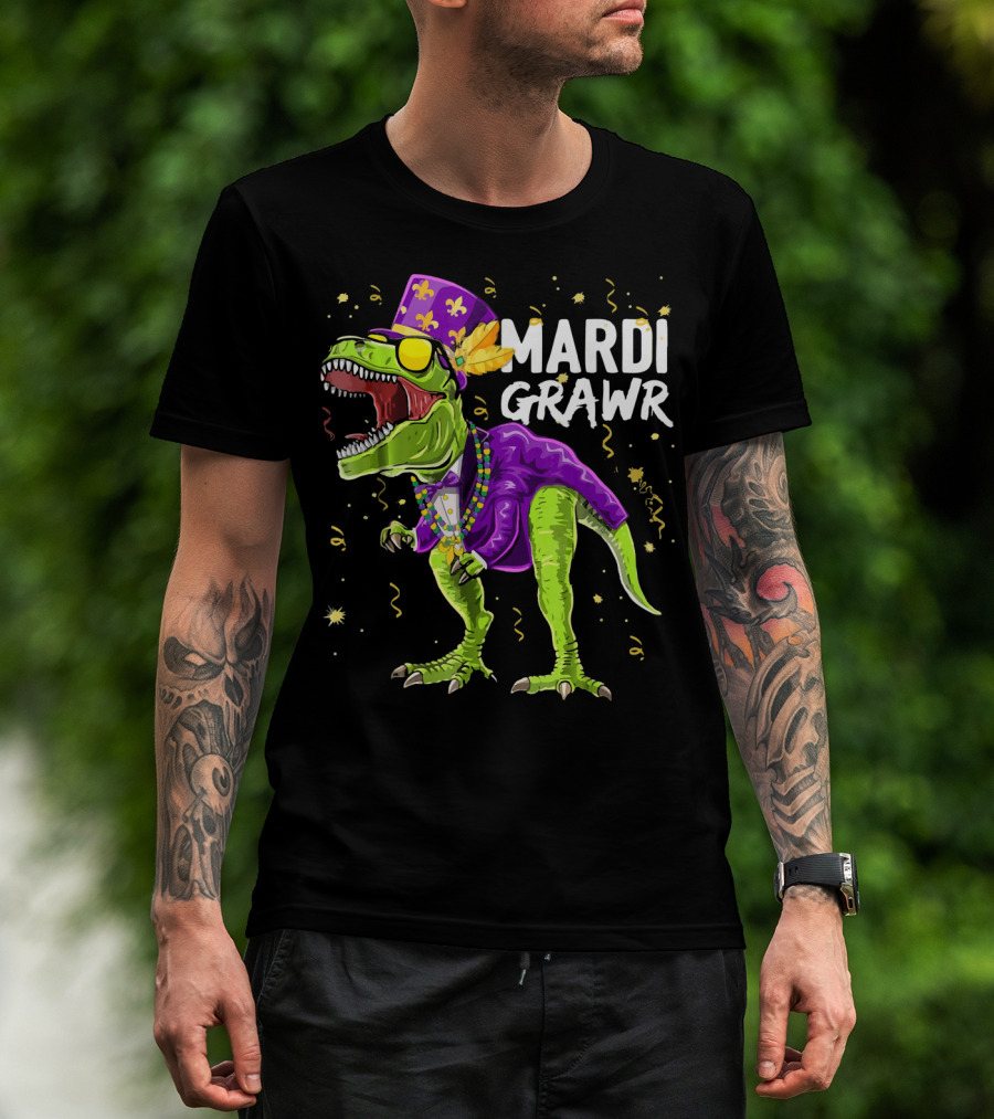 How much will this Mardi Gras Dinosaur Mardi Grawr Carnival Roaring T-Rex with Beads and Hat shirt shrink?