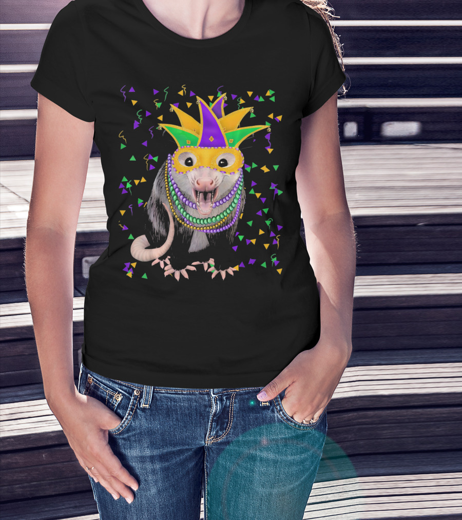 Mardi Gras Possum Wearing Colorful Mask And Beads With Confetti T-Shirt