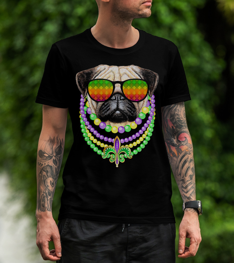 Pug With Beads And Sunglasses Fleur-de-Lis Mardi Gras T-Shirt