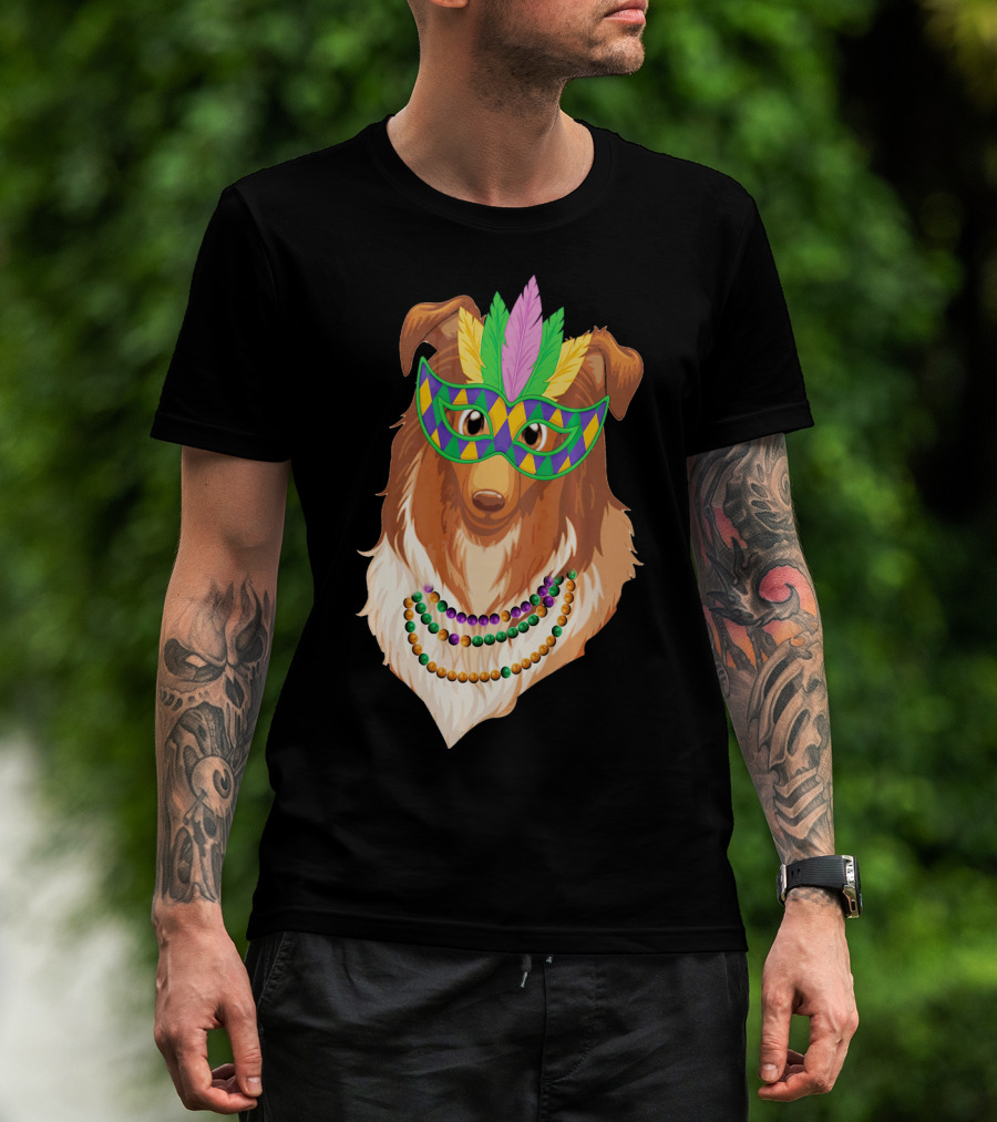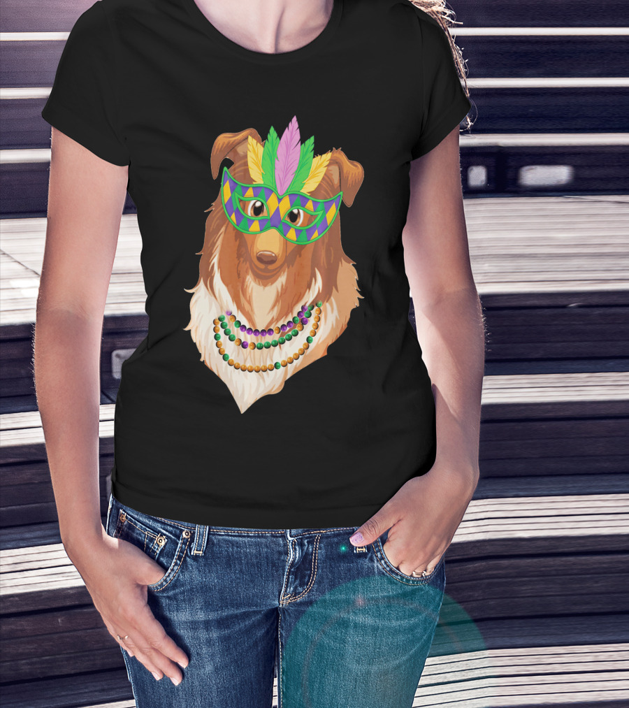 Collie Wearing Mardi Gras Mask And Beads T-Shirt