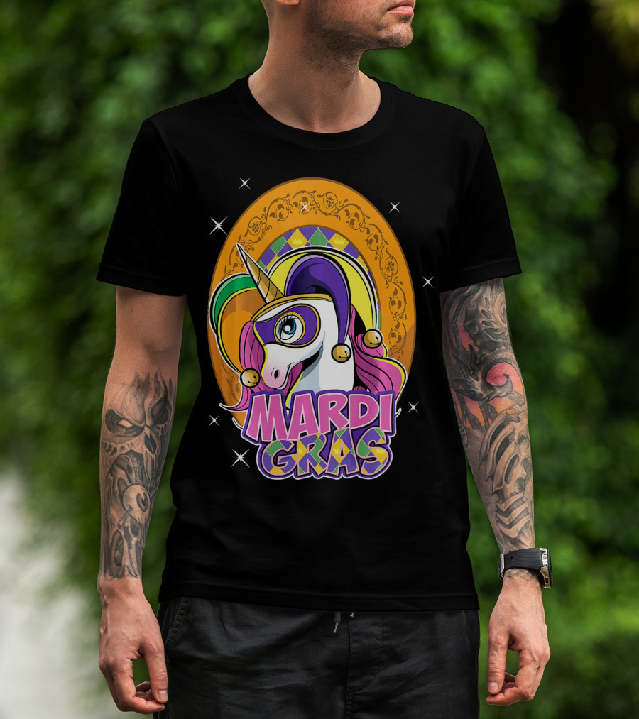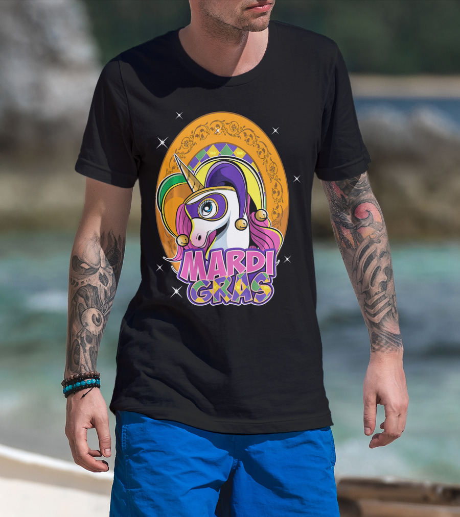 Mardi Gras Unicorn Mask Jester With Colorful Headpiece And Stars T-Shirt