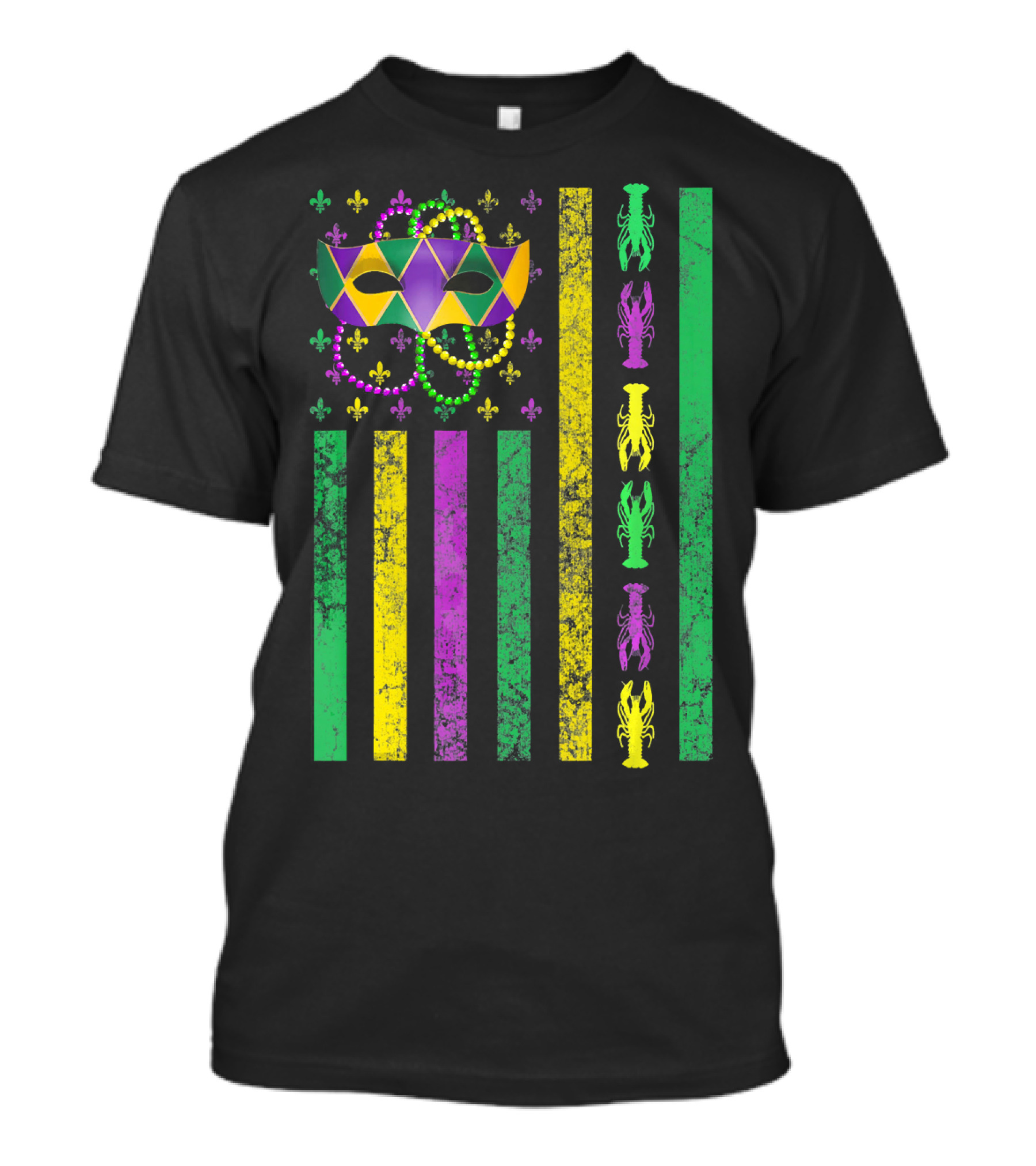 The Mardi Gras Mask Beads Crawfish with American Flag Stripes T-shirt is designed for everyday wear and a consistent fit. Fabric is pre-shrunk ring-spun cotton with durable stitching. See the size chart below for exact measurements.