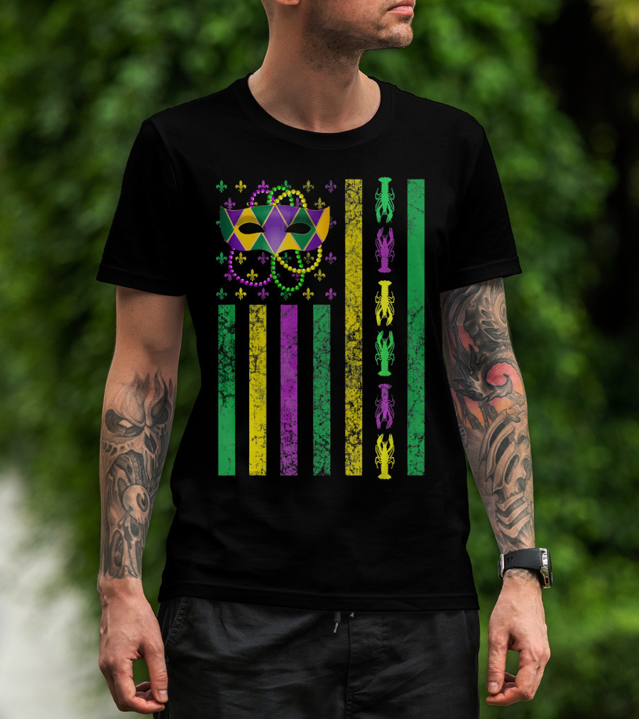 Mardi Gras Mask Beads Crawfish With American Flag Stripes T-Shirt
